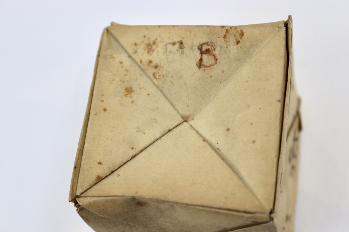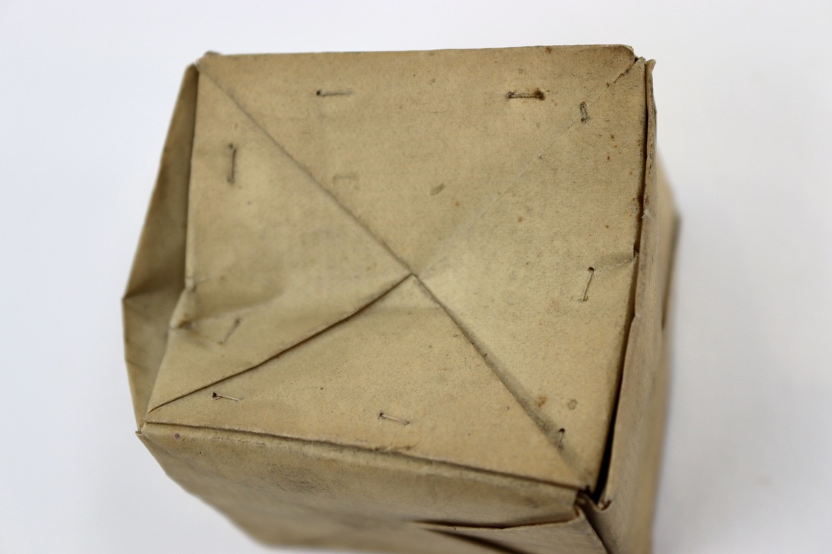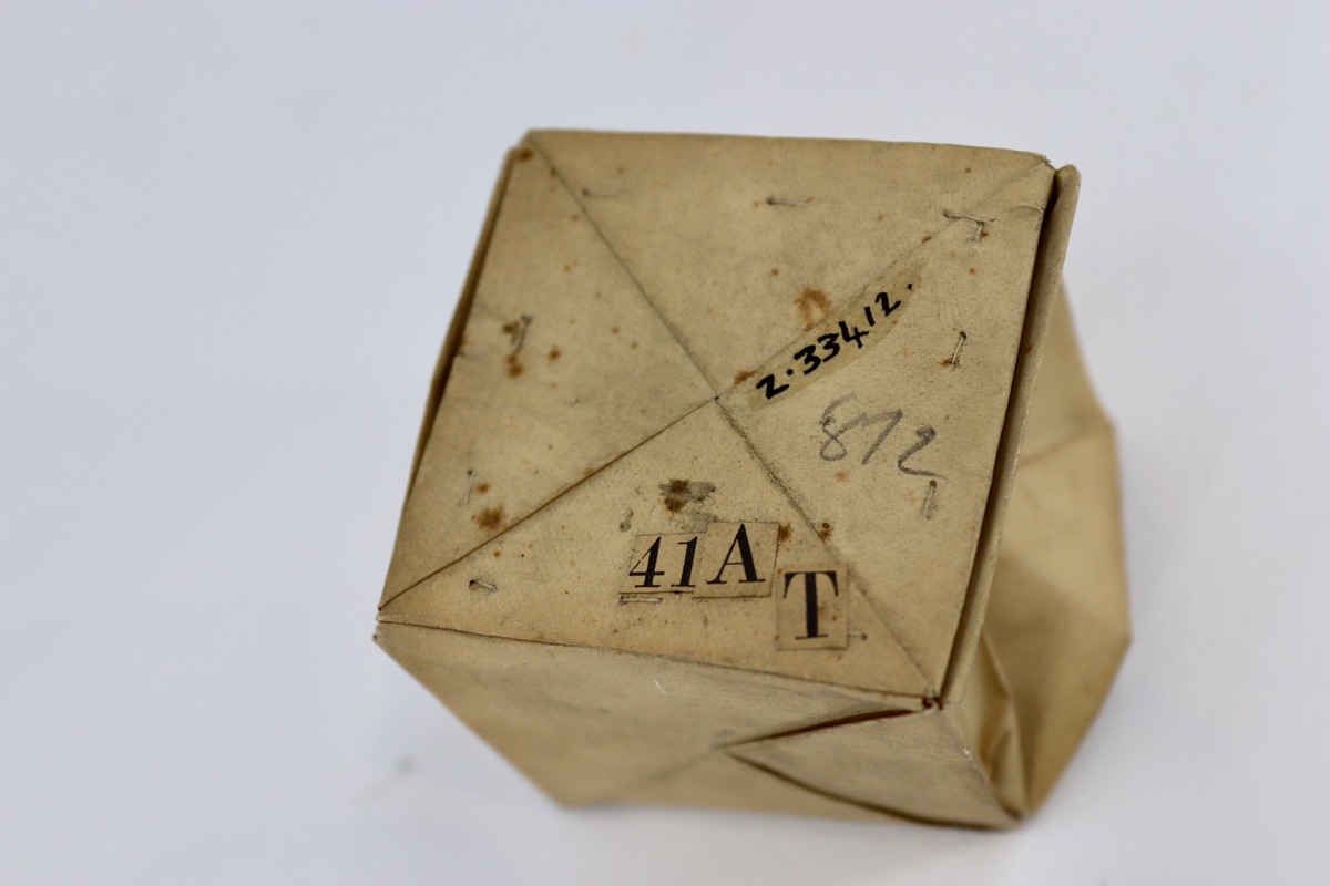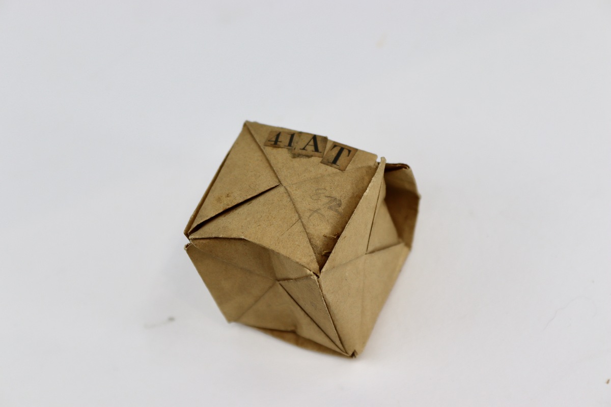 Four old printed paper labels pasted on the four cubic boxes individually, reads '41 AT'. Author and date unknown.