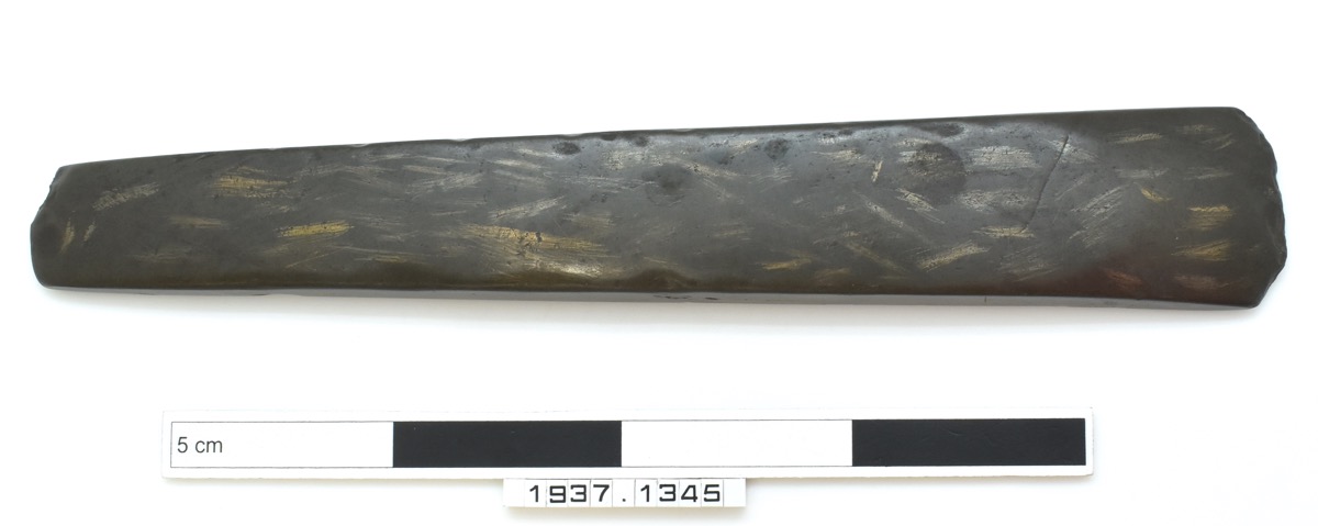 A polished stone adze, possibly shale, with a plano-convex cross-section, square sides, narrow butt and wider and slightly curved cutting edge. It is covered in multidirectional gold coloured marks or scratches.