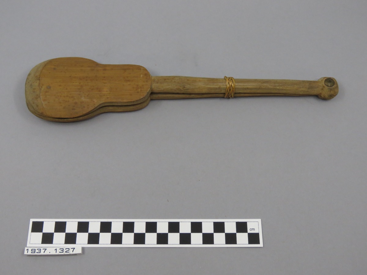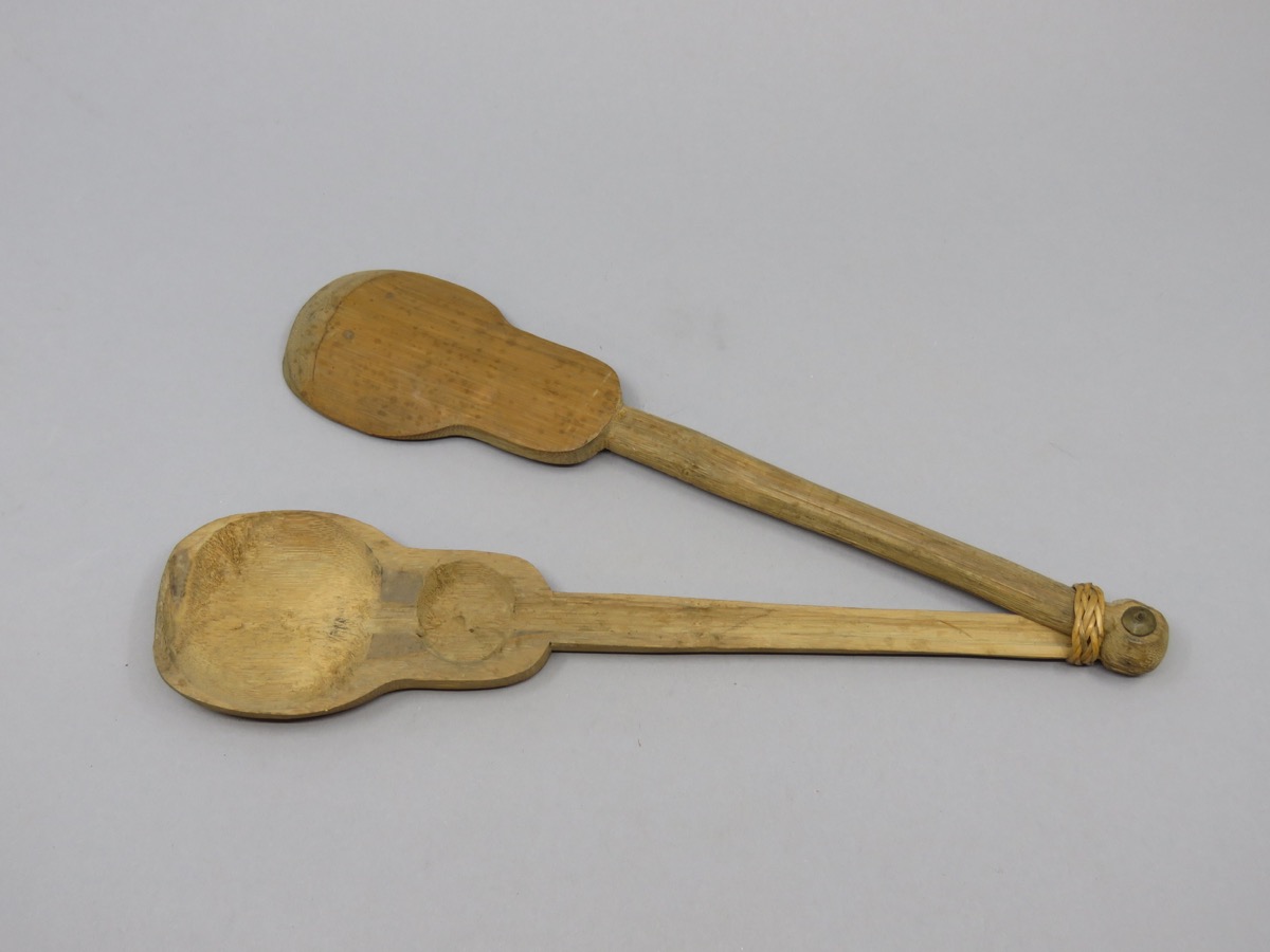 Clapper - Wooden clappers.Two fiddle shaped halves joined together by brass stud at handle end and kept together by a loose straw plaited band