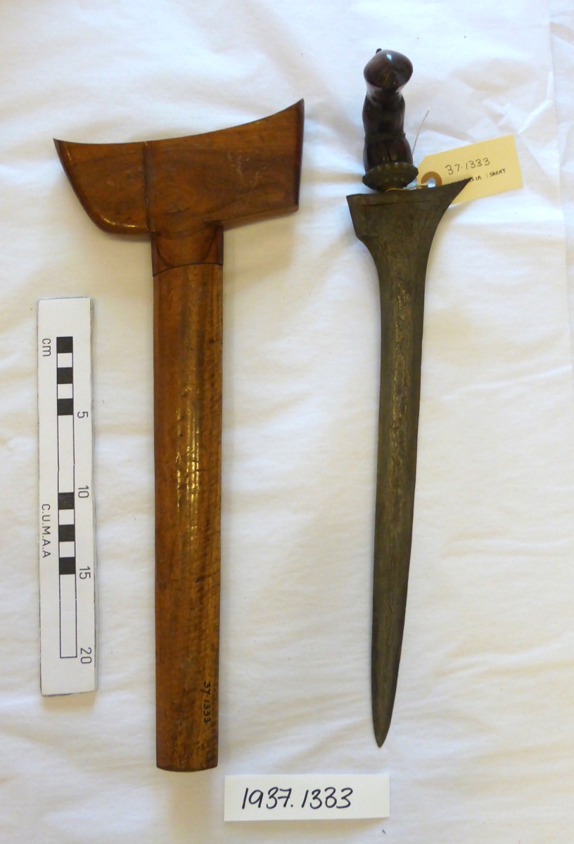 Kris in T-shaped wooden scabbard. Straight blade, bent at right angles and turned round so as to be at right-angles, also to the scabbard