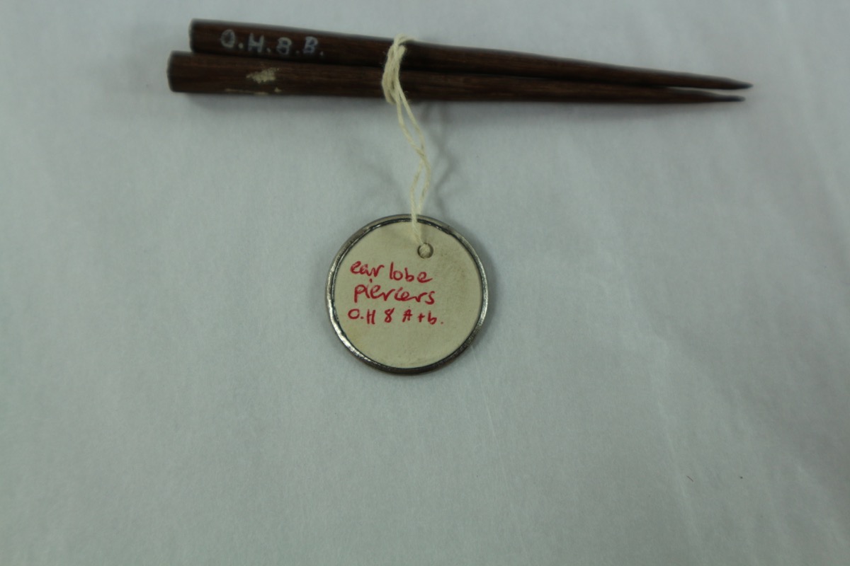 A tool or awl of hard, red wood for piercing the lobe of the ear. Also Used for piercing ear lobes of infants for insertion of decoration