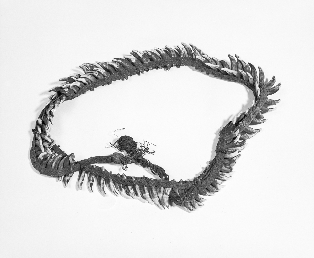 Necklace - Card 1: 'SESERIG Necklace of dogs' teeth; a fine old specimen.'