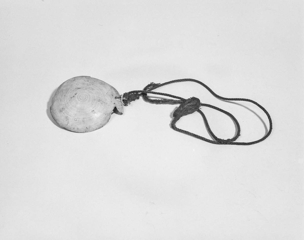 Dibi-dibi. Chest pendant made from top of a cone shell, wauri (Conus litteratus var. millepunctatus) with 4 notches on the margin and attached to a string necklace.
