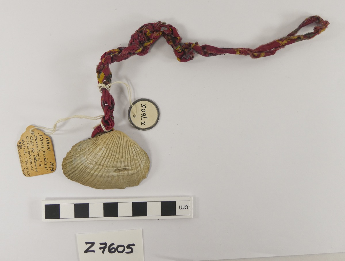 Chest pendant consisting of a shell attached to a strip of coloured calico.