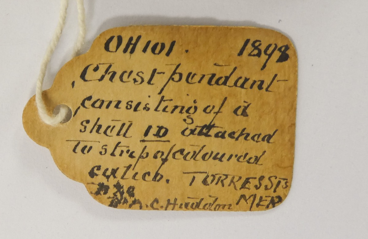 Card 1: 'Chest pendant consisting of a shell ID. attached to a strip of coloured calico.'