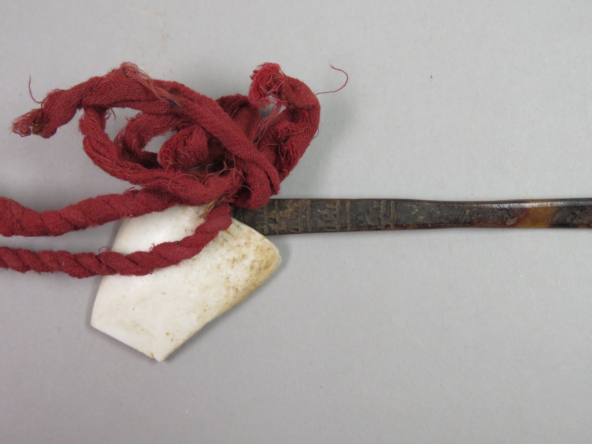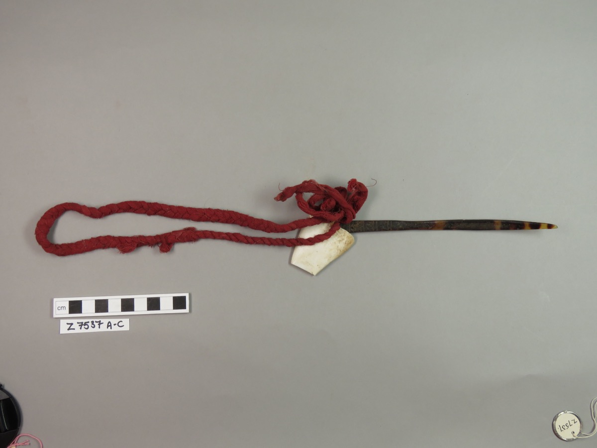 Tortoiseshell ter or luper used for piercing ears, with a small white shell o attached to a necklace of red cotton trade cloth