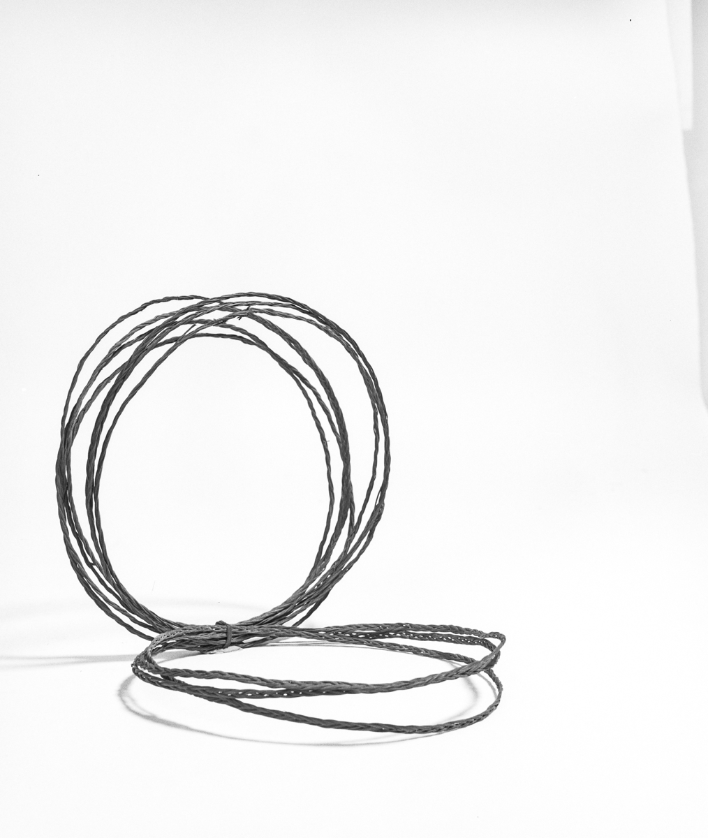 Card 2: 'Bundle of leg bands plaited from fine surface roots of the coconut.'