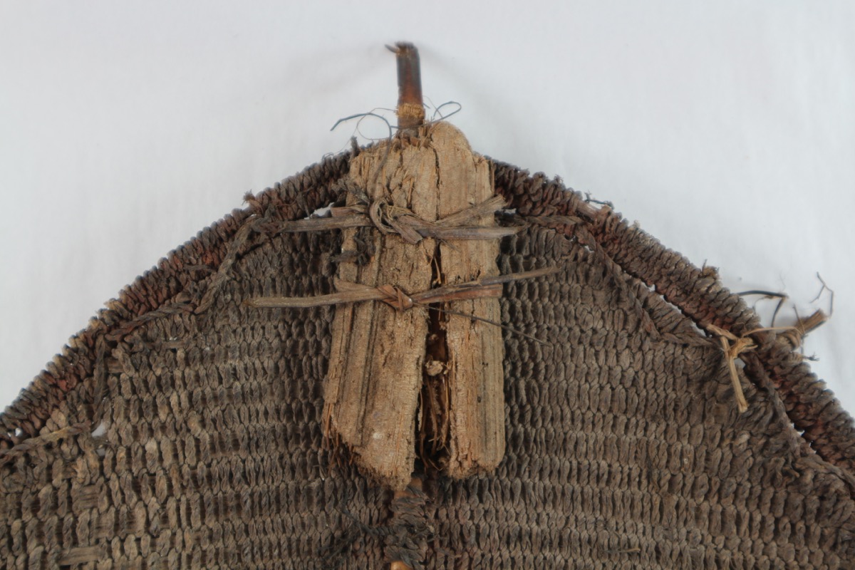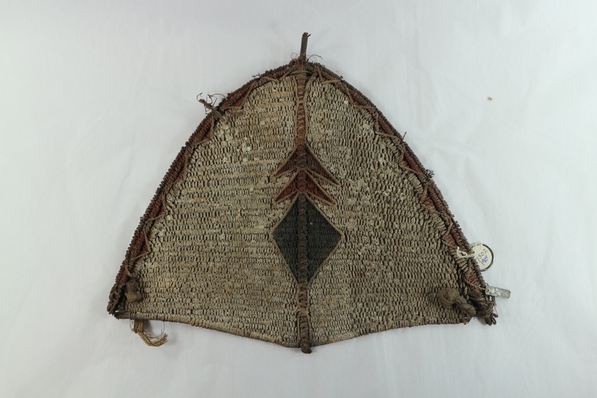 Card 2: 'cane frame bound with cocobut [sic 'coconut'] fibre string. Chevron & diamond pattern up centre, ochred red, white, black.'