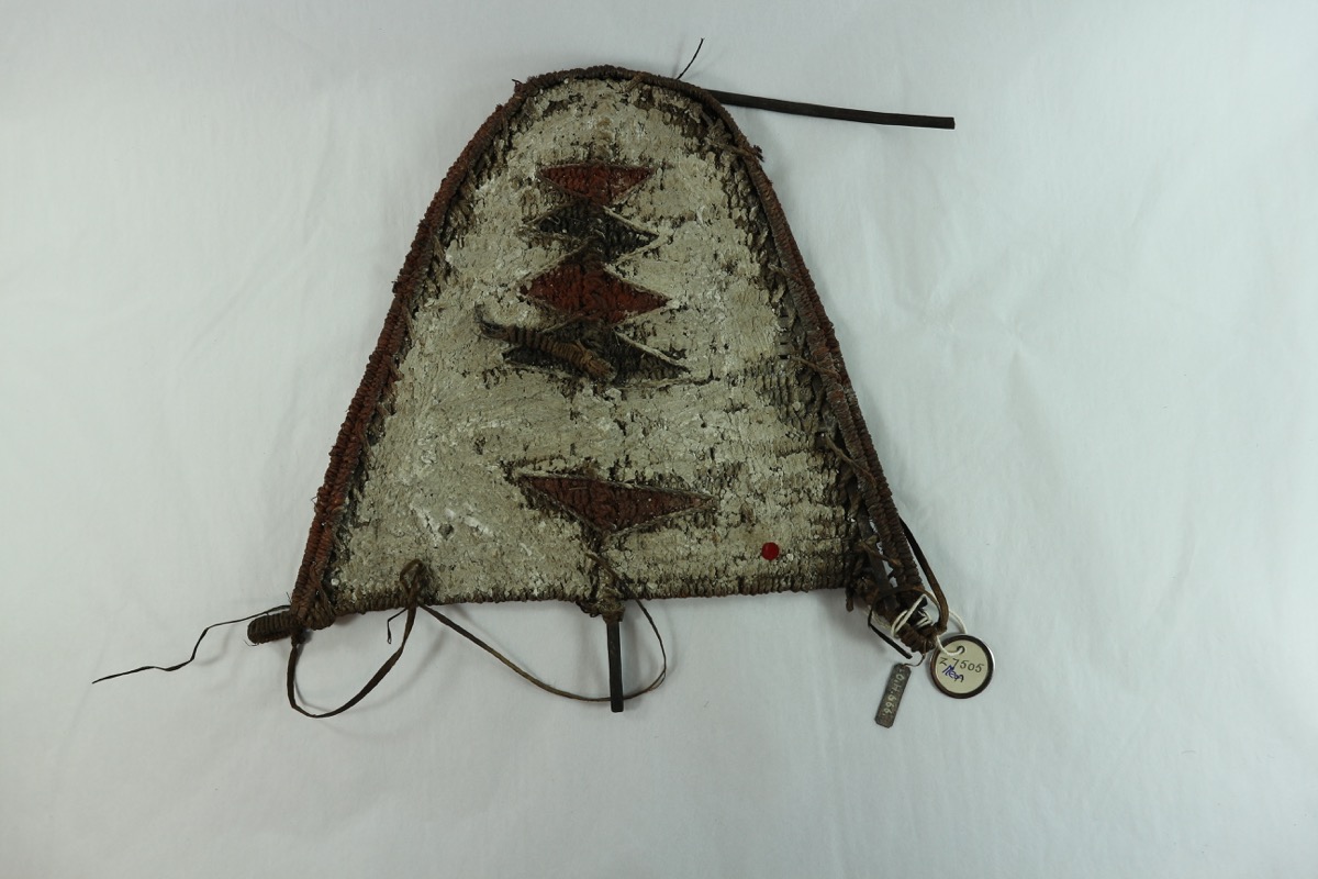 Card 2: 'cane frame bound with coconut fibre string. Body infilled and decorated with double chevron design in red, white and black ochre.'