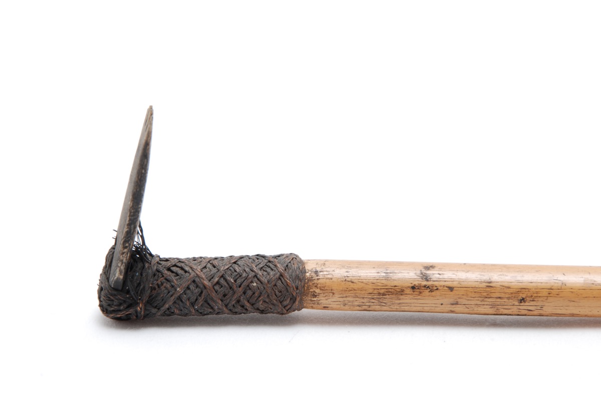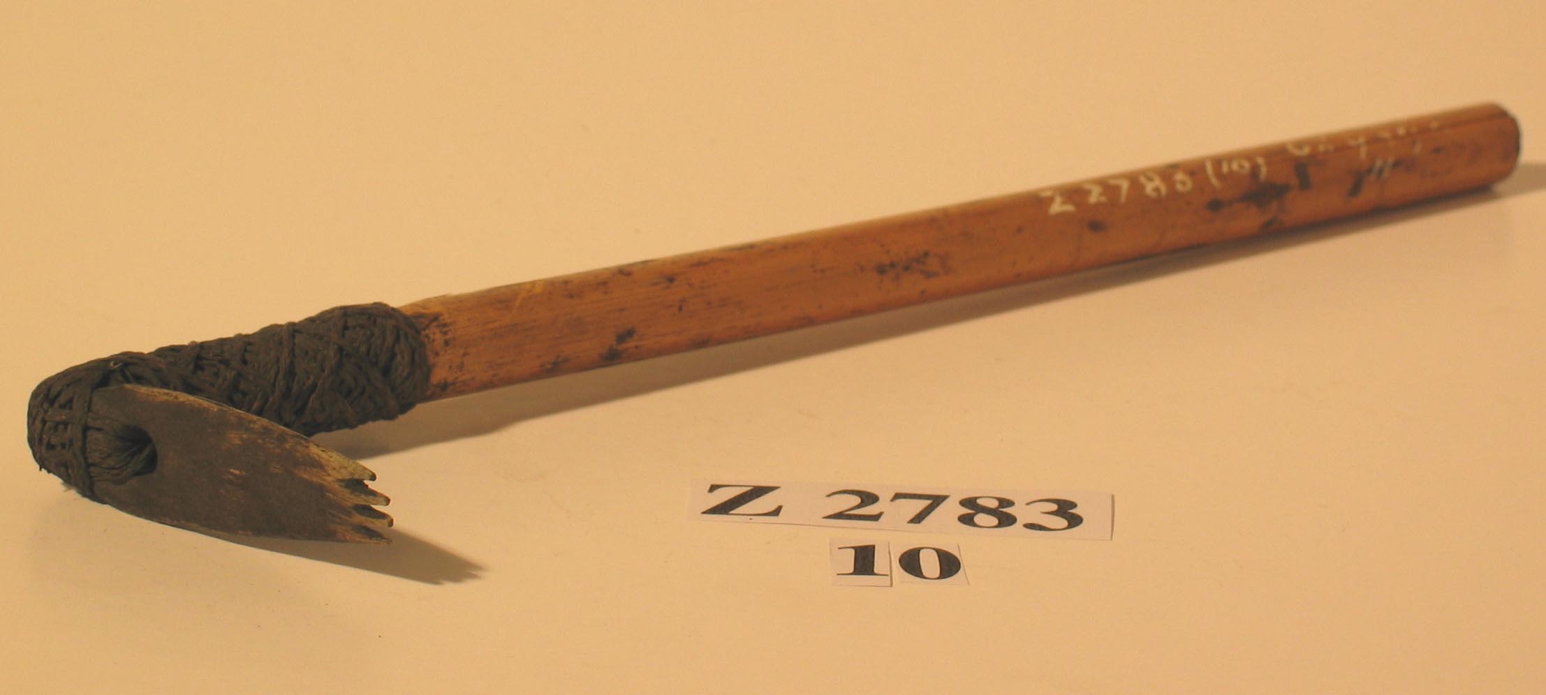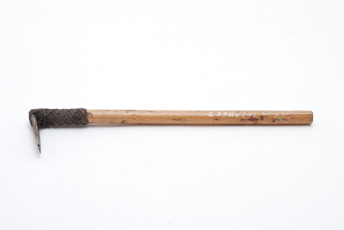 Tattooing adze. Haft of bamboo. Head of bone, Oval in shape and carved with four teeth. The top of the head is pierced with a round hole through which passes several length of very finely plaited (3-ply) coir cords. The binding continues for about 4.2 cm down the haft, forming a diamond pattern. Black pigments visible on the haft, head and binding.