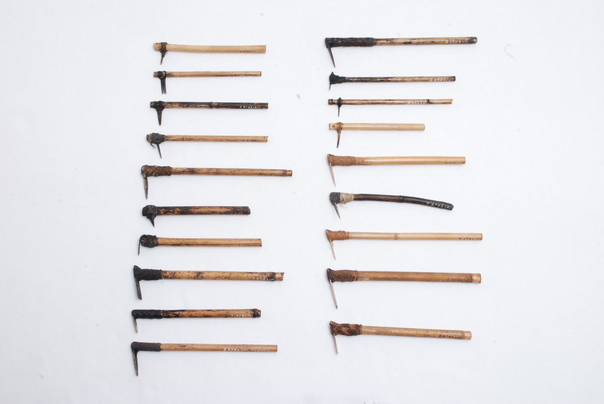 Catalogue card 3 reads [handwritten in black ink:] '3 LEVUKA, OVALAU Isld; 11 RAKI RAKI / NA VUA VUA; ?5 VITI LEVU RA PROVINCE RAKI RAKI'. Tattooing implements, Case 2, 19 in number: - Taken from some of the Baron von Hugel's notes, - "Bamboo (bitu) case with set of 10 tattooing implements, bati ni veggie "Teeth of the tattooing" (place) Na via via, Raki rake Viti Levu." Case made of the lower part of the internode of a bamboo 240 mm long by 80 mm diameter. "Presented 1875 by the woman who had been in the habit of using them. At this date girls were occasionally tattooed in the Ra district, Viti Levu, but in the interior of the island the practice had not then been abandoned." A.P. Maudslay 3, Von Hugel 11, A.H. Gordon 3, Dr: Brady 1, Unrecorded 1' Show Case 2.