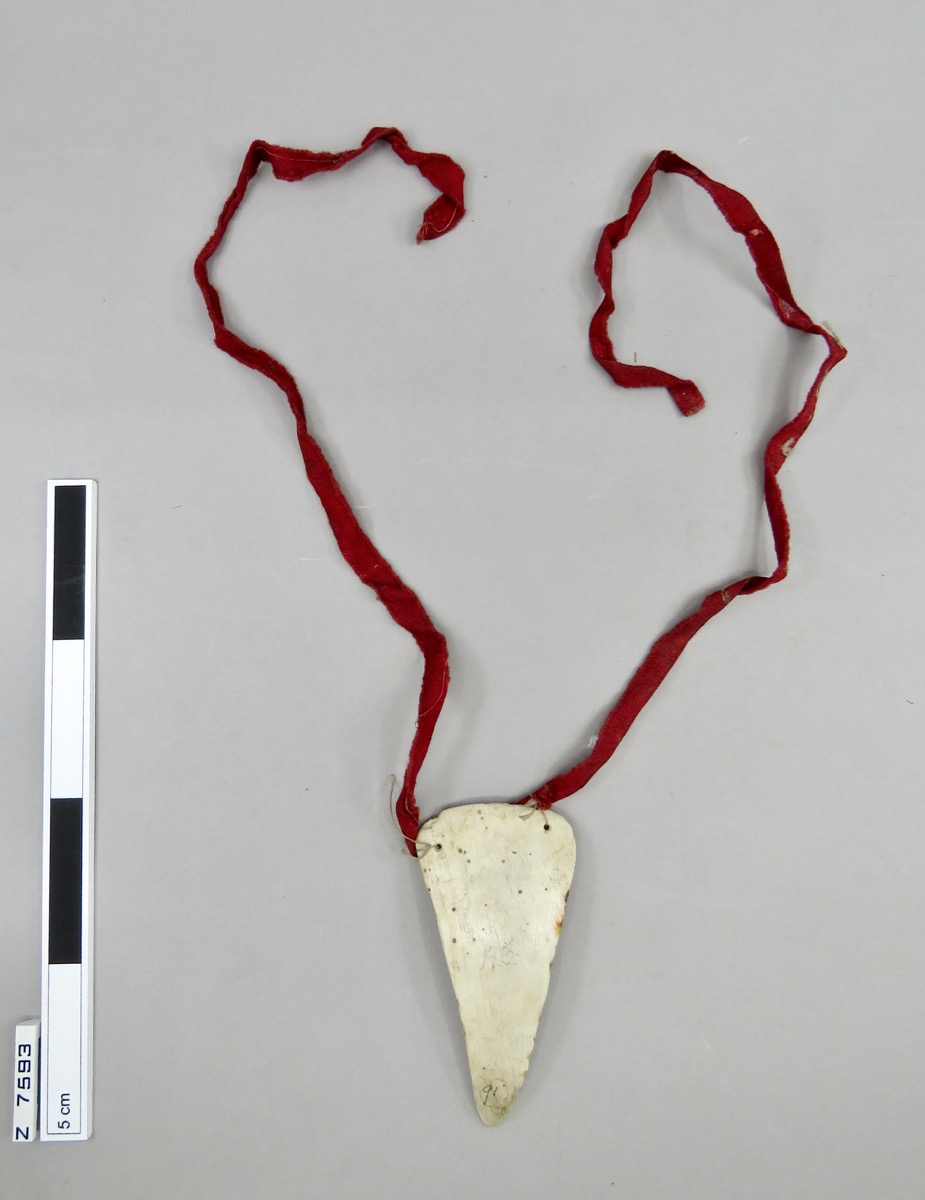 Card 2: 'Ground shell pendant attached to necklace of red European material through hole at tip.'