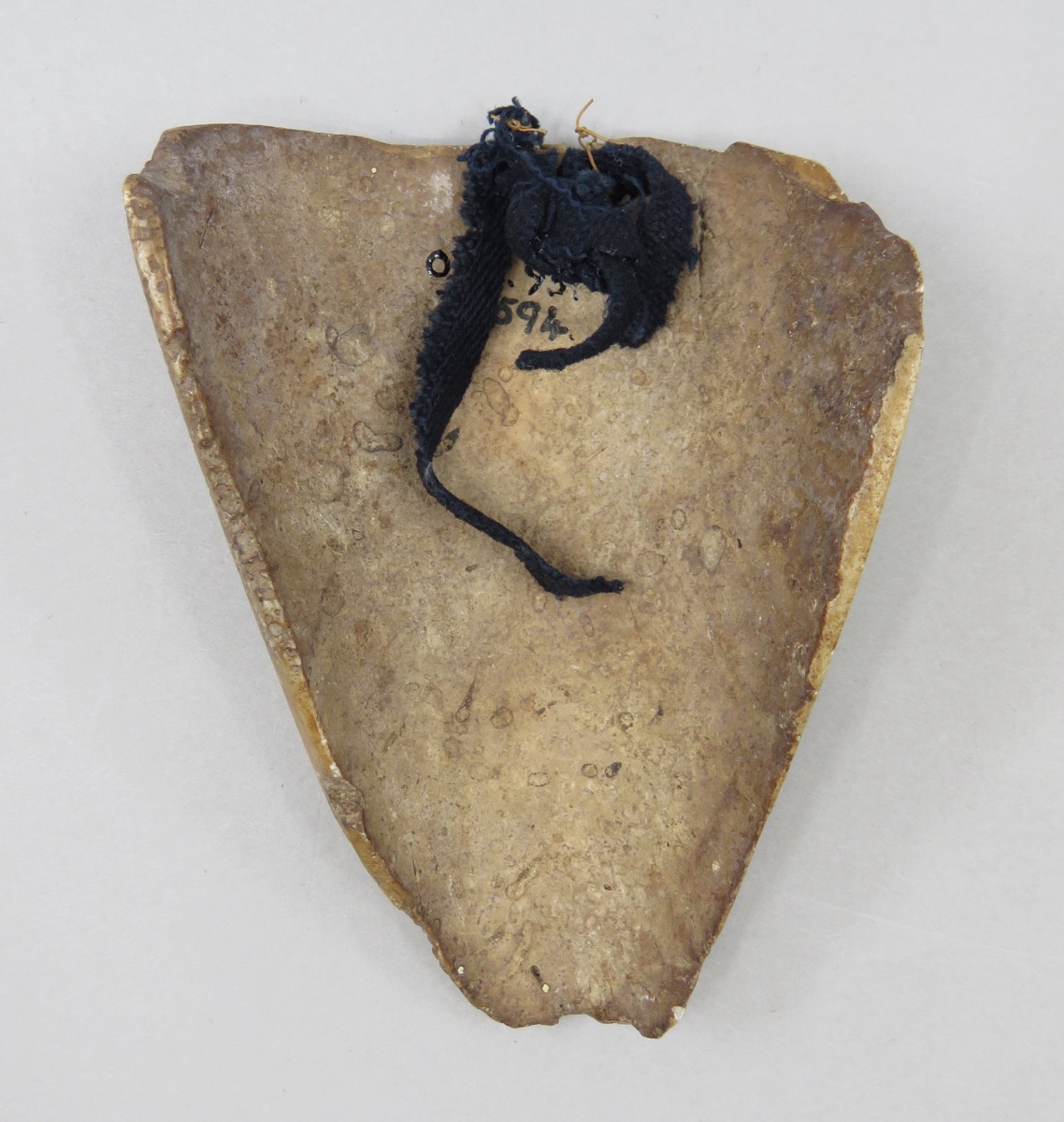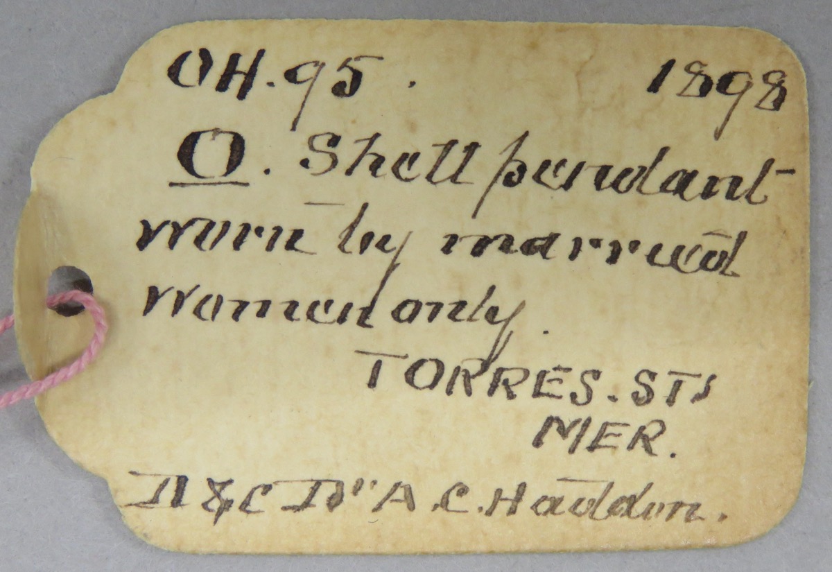 Pendant - Card 1: 'O. Shell pendant. Worn by married women only; attached to remains of a dark blue stuff necklace'