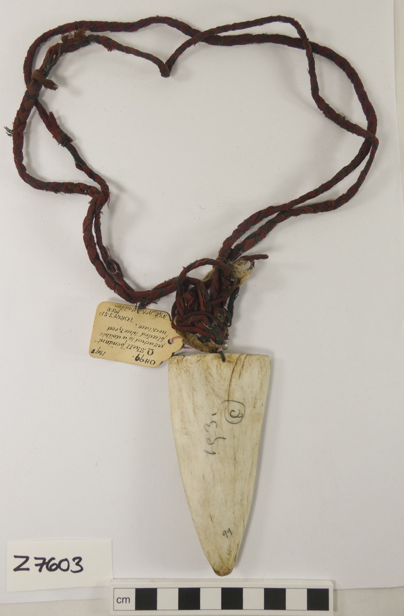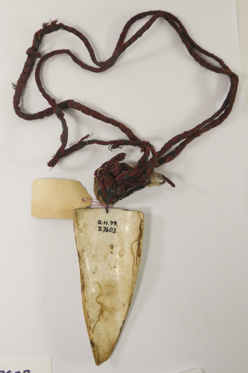 Card 1: 'O. Shell pendant. Worn by married women only; attached to a double plaited necklace of dark blue and red stuff, halved coix seeds.'