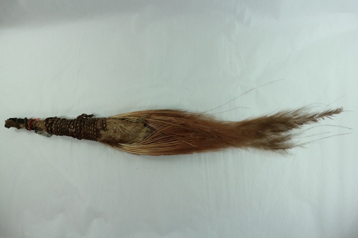 Worn on headdress, in armguard, etc., for ceremonial use. Said to be imported from New Guinea; Fair