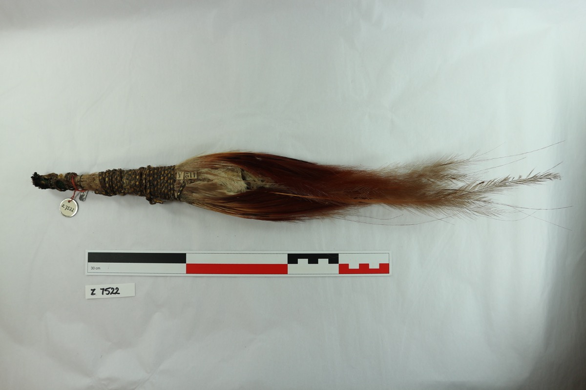 Card 2: 'Plumes of bird-of-paradise bound to a stick with black and yellow native braid. The head is missing.'