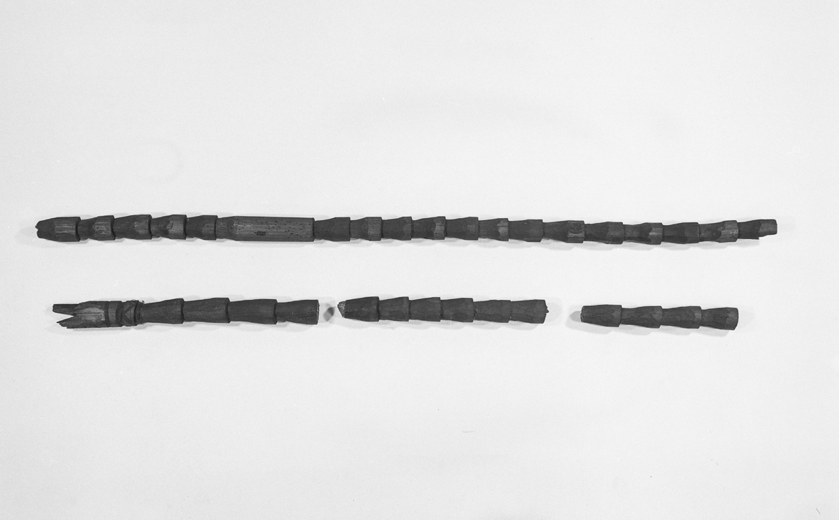 Two sticks cut into segmented shapes. Segments coloured alternately red, black, and natural. Incised chevron decoration on top segments. Top broken; Broken