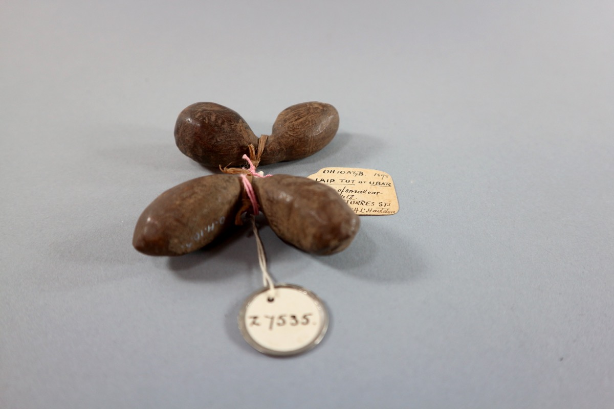 Card 2: 'Carved from light wood (probably Manilkara kaukii) in shape of two lobes joined by narrow constriction.'