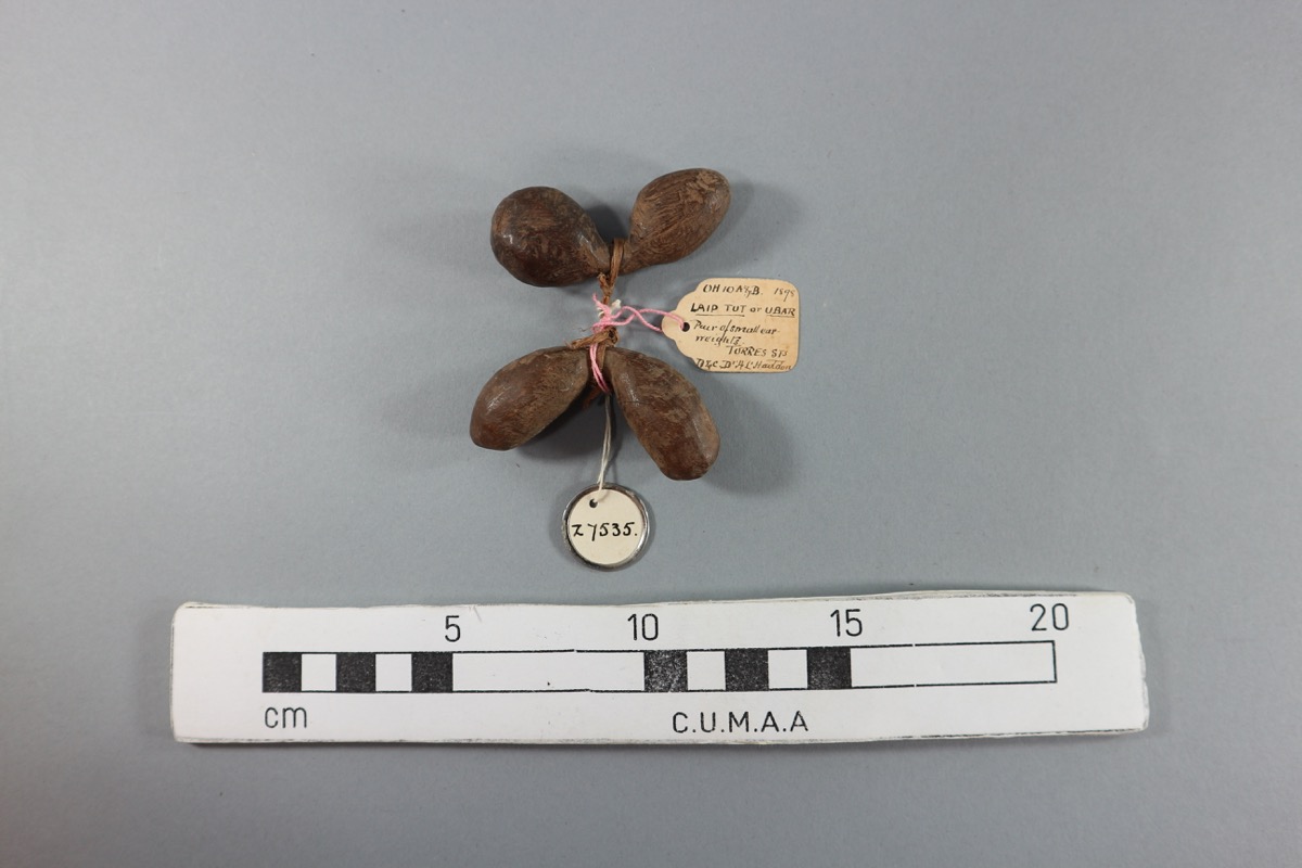 Ear weight carved from light wood in the shape of two lobes joined by narrow constriction. For distending ear lobe and for decoration.
