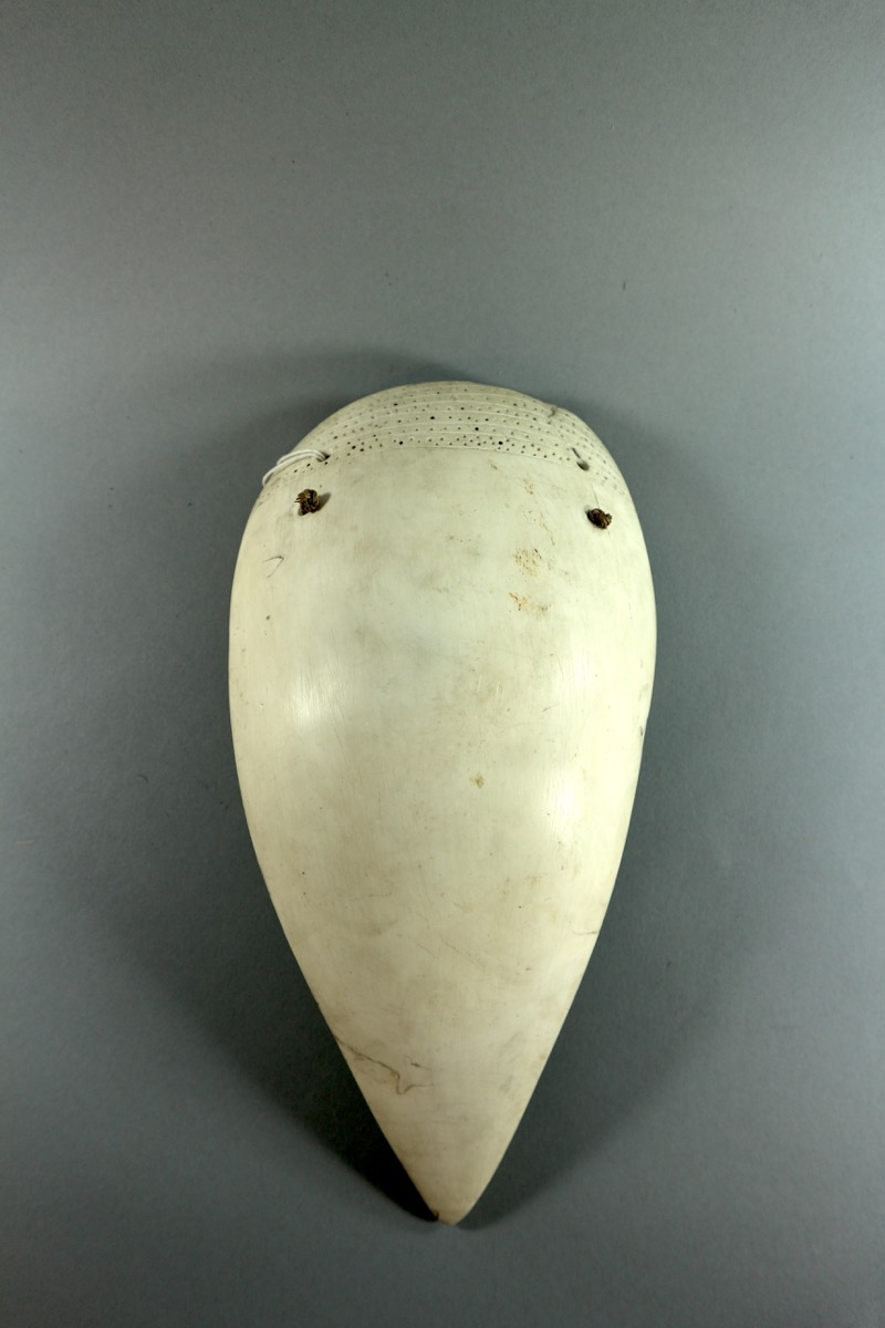 Card 2: 'Triangular curved segment of Melo shell with incised decoration of lines and dots along top, where two holes bored for attachment. Belt of woven coconut fibre attached by loops knotted through holes.'