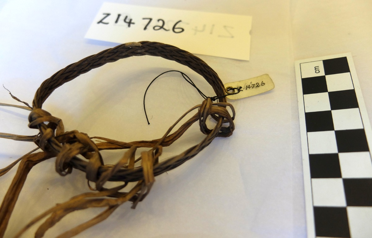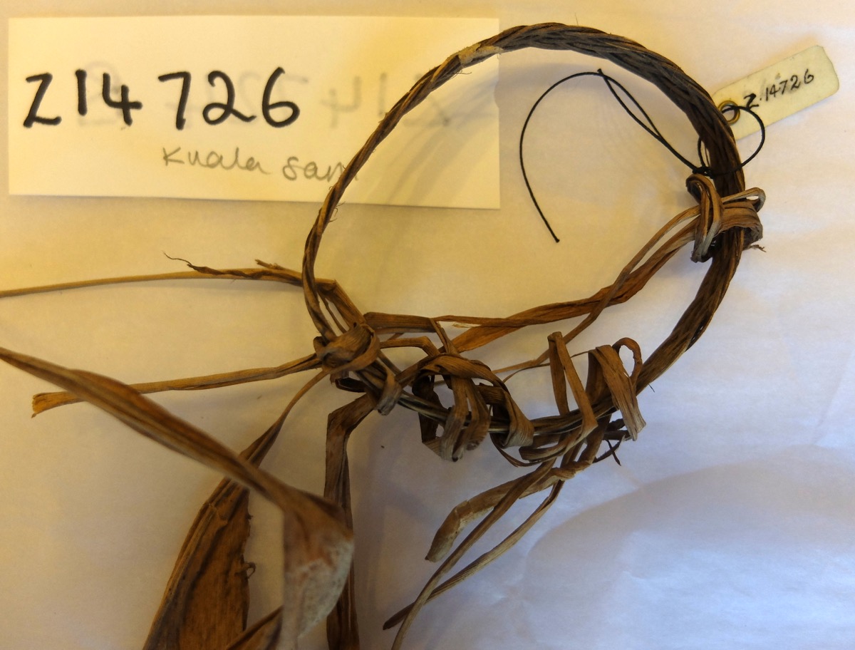 Woman's armlet with plaited rattan and suspended leaves. The rattan has been dyed dark brown and some left buff/natural.
