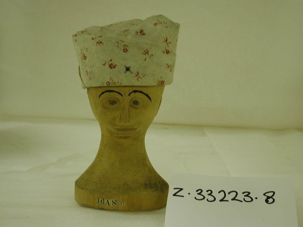 One of a set of eight wooden heads showing different ways of wearing turbans. " Malaiyu : tight sealing of the Malays "