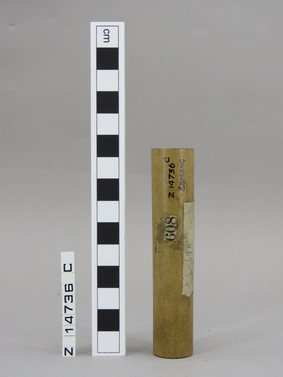 Bamboo flask or tube, decorated with roughly incised concentric rings intended for carrying gunpowder or bullets.