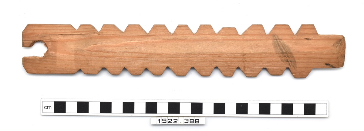 Bullroarer, consisting of a thick rectangular wooden board with large trapezoid serrations along the long edges. The board has a pointed oval cross section. One end has a large circular perforation, broken through to the top edge. The other end has a narrower rectangular section without notches.