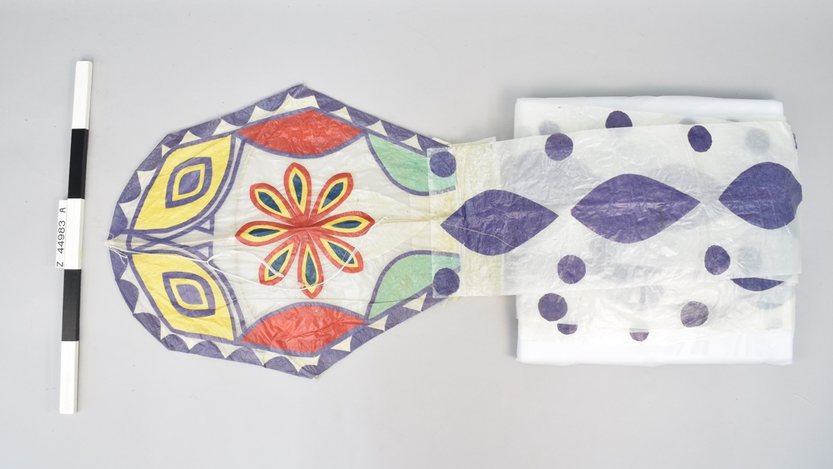 Paper kite. Oval shaped, with flower decoration at centre and very long, blue and white tail.