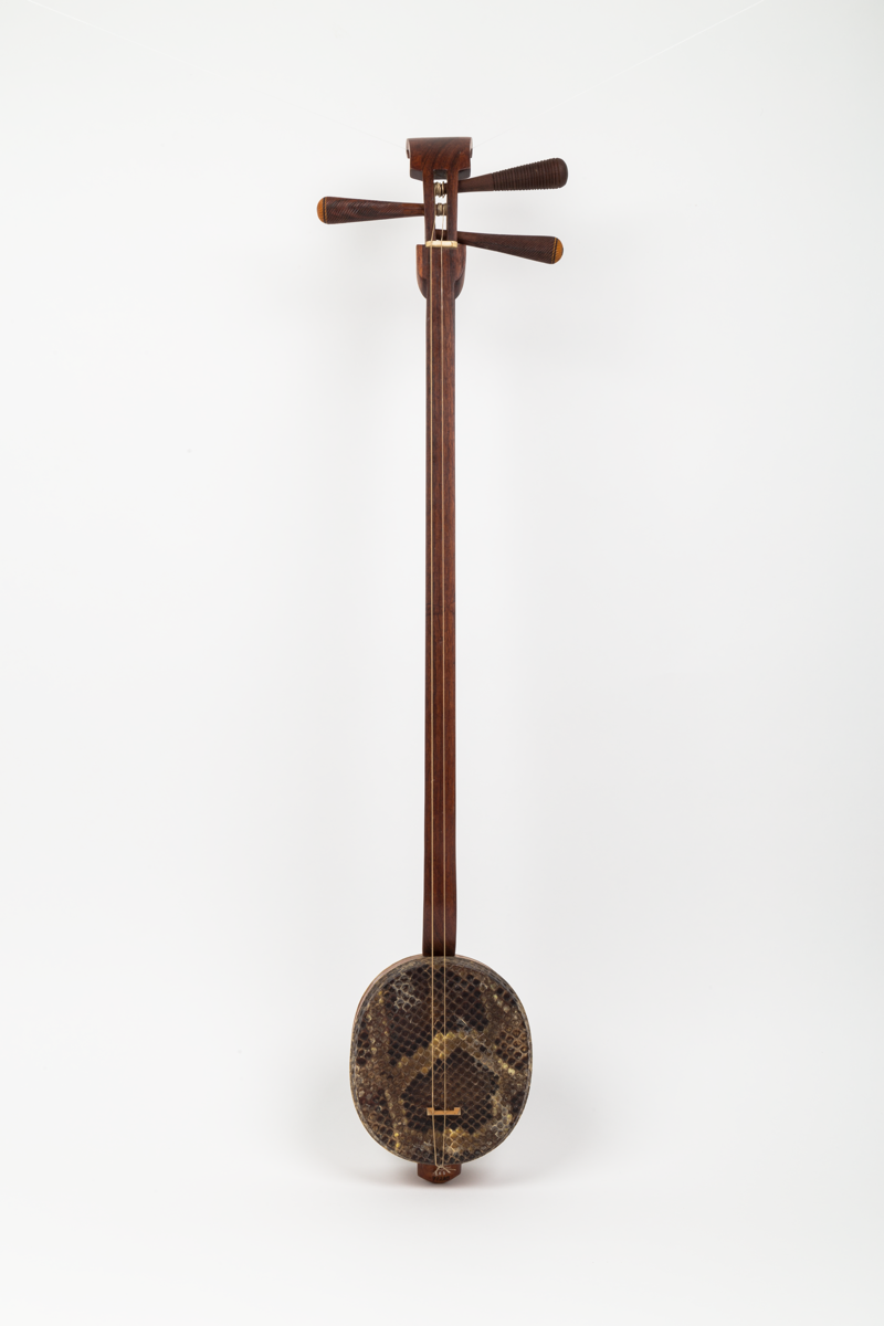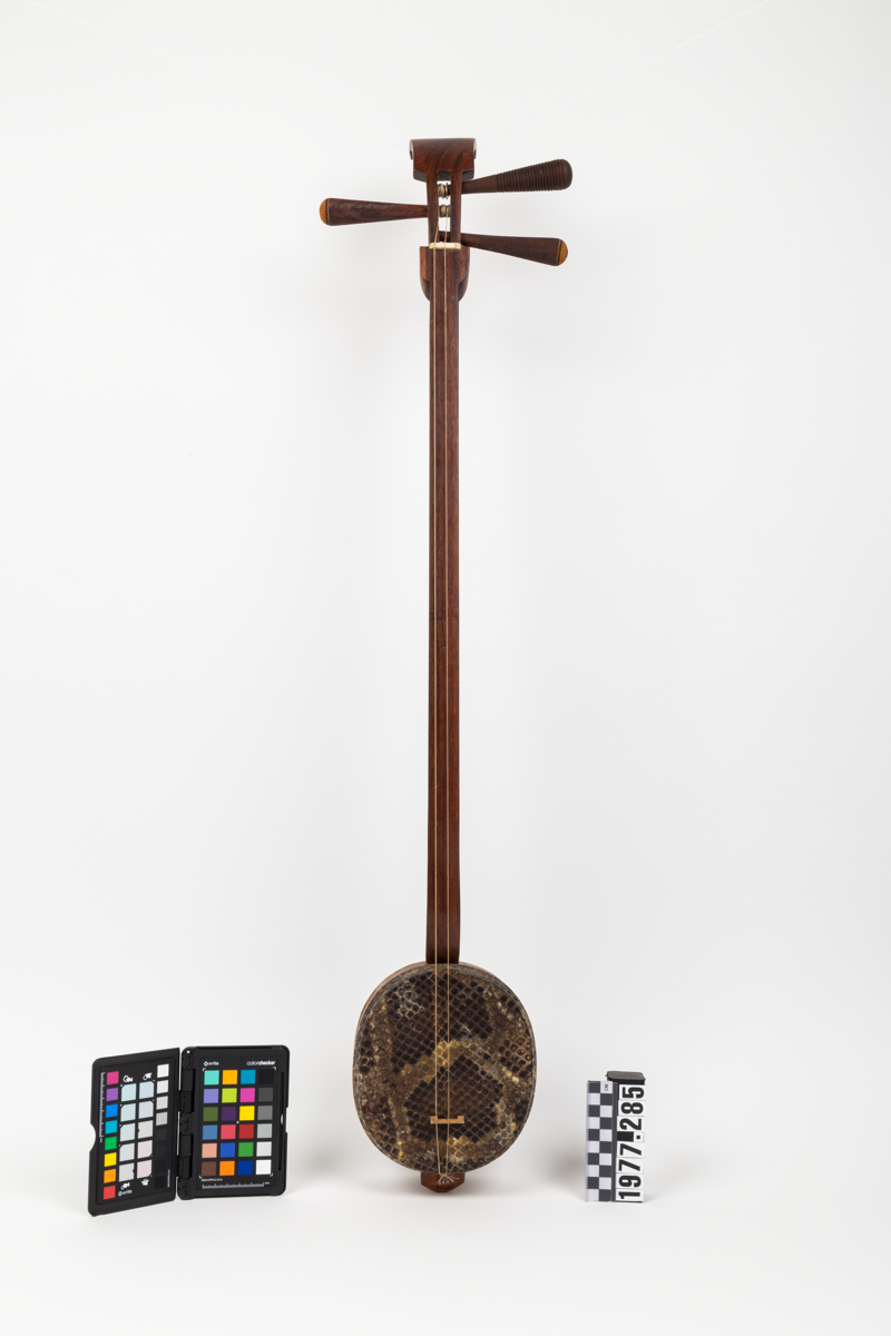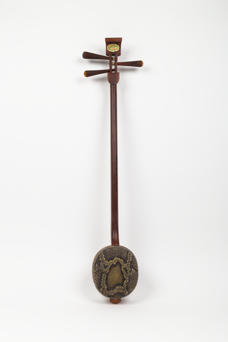 Musical instrument (stringed), a spike box-lute with snakeskin table and snakeskin cover over hole in rear of body. One peg broken in transit.