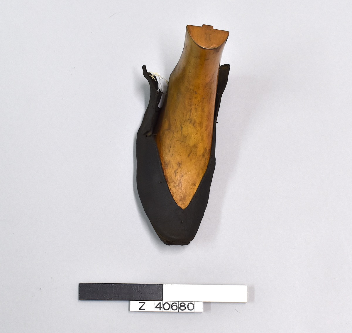 Wooden last for right foot with leather upper.