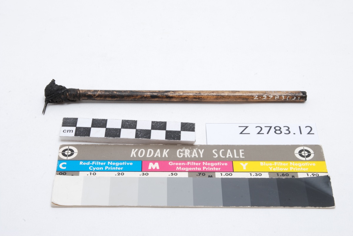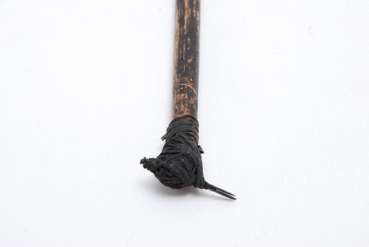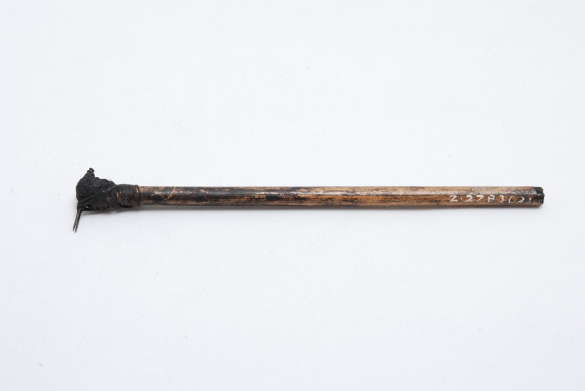 Tattooing adze. Haft of bamboo. Head formed of three metal pins, placed in a triangle, inserted through the haft (the rounded heads of the pins are visible at the back) and bound with a thin cord of twisted vegetable fibre and a length of twisted hibiscus. Black pigments visible on the haft, head and binding.