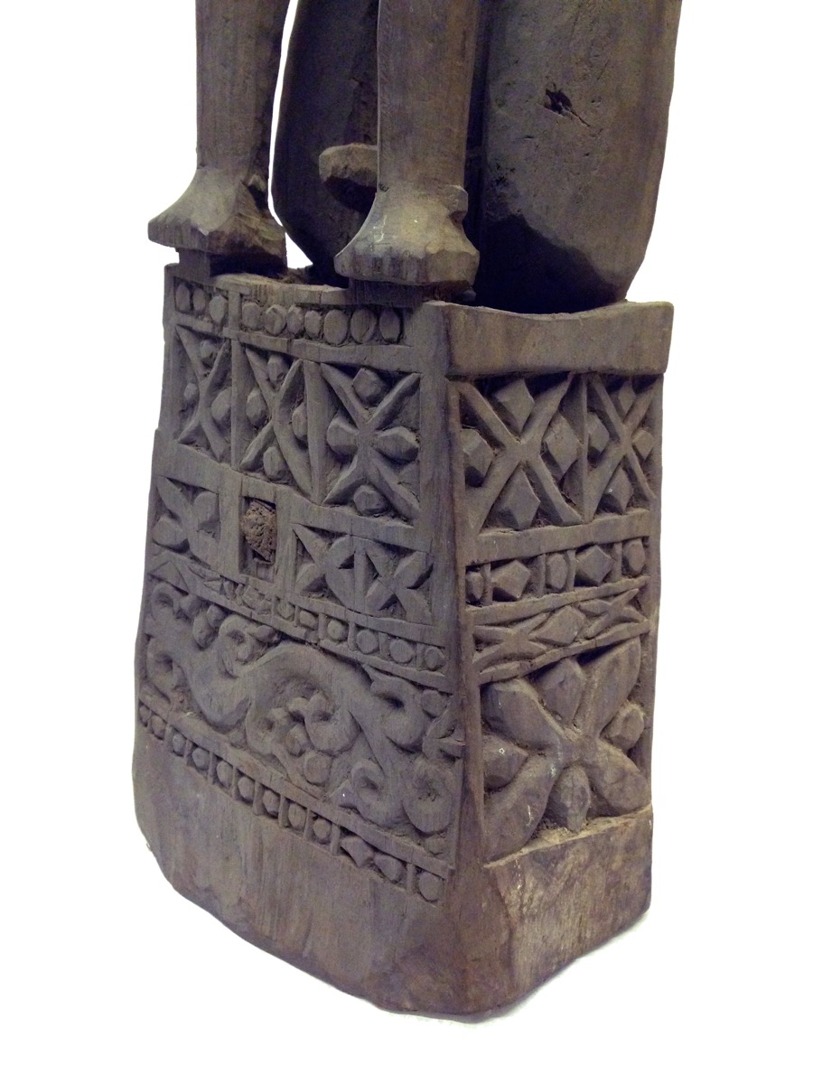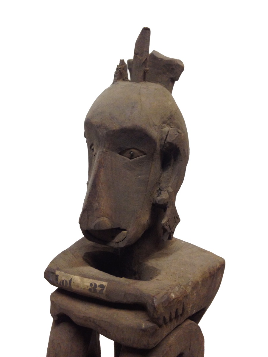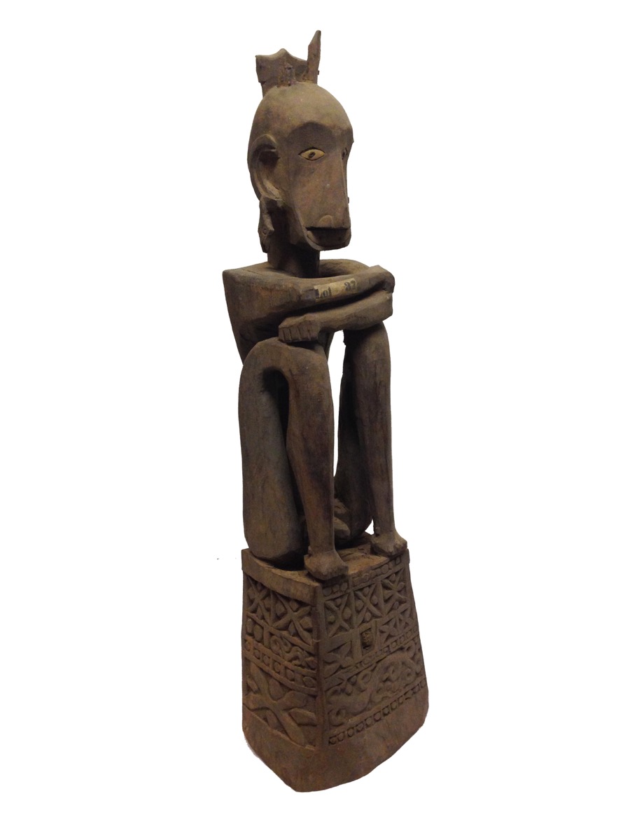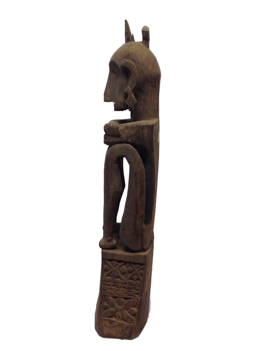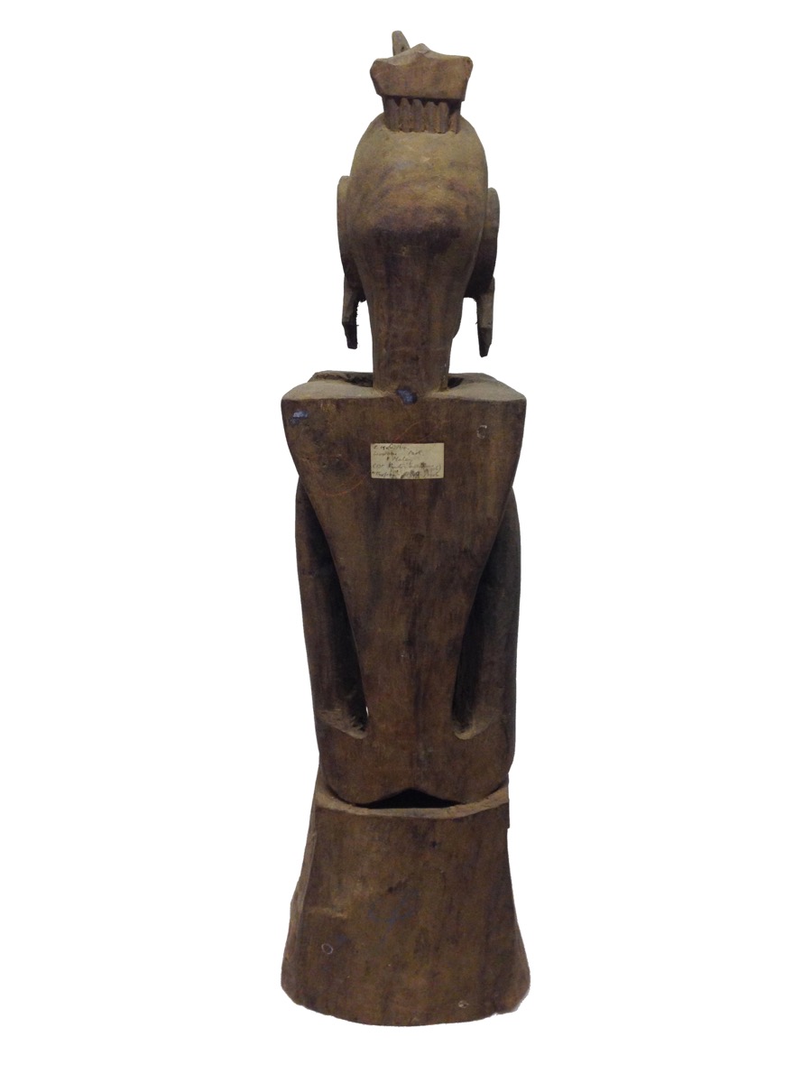'Ancient WOODEN IMAGE representing a much conventionalised, squatting nude male figure with folded arms resting on its knees, ornate earrings and eyes and mouth inlaid with white shell: the head bears a triple crest and the pedestal is square and ornately carved.'