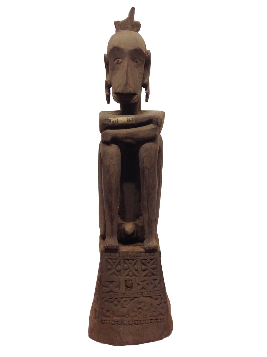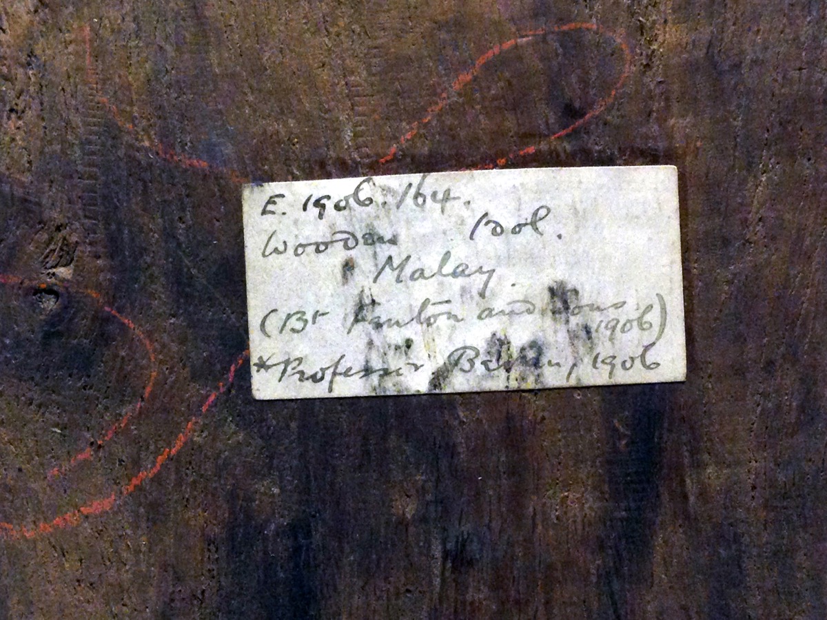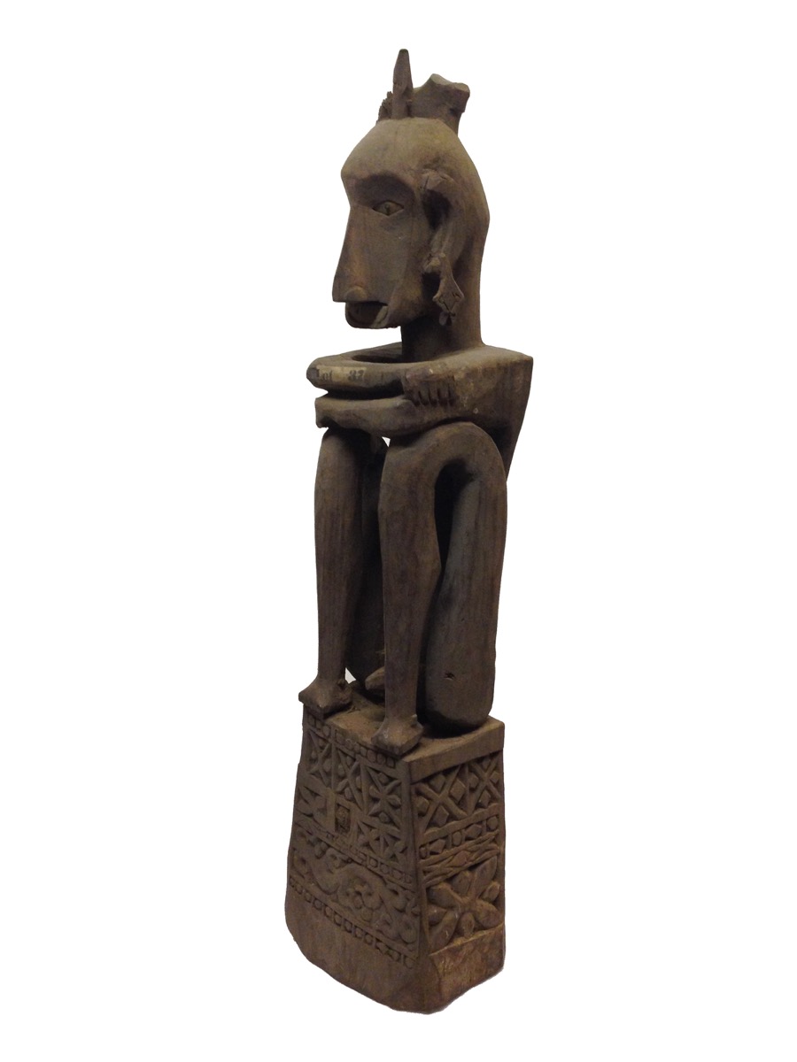 MAA Annual Report 1907: MALAY ISLANDS: '406-408. Three ancient wooden images, each representing a much conventionalised, squatting, nude male figure, with folded arms resting on its knwws, the eyes and mouth being inlaid with white shell: in two the head bears a triple crest, in one (h.24.5") the pedestal is square and ornately carved, and in one (h.26".6) orange-shaped, with plain culindrical base; and in one (h.24".3) the head is covered with a hat, and the upper half of the square-sided carved pedestal bears four large square perforations (h.24".3). ?Timor Laut. *Professor Bevan.'