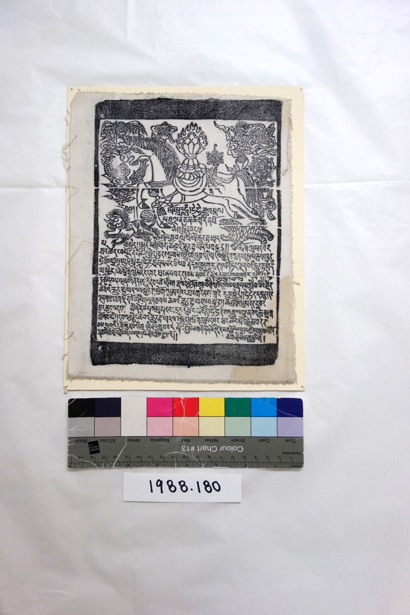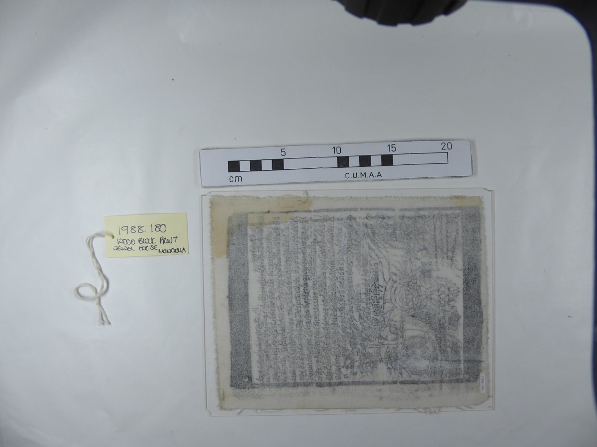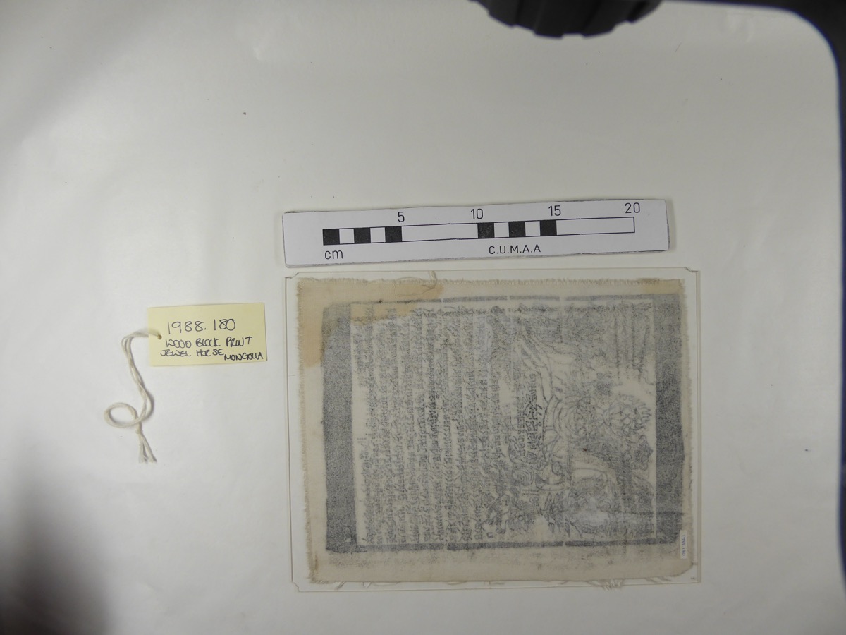 See Humphrey file; Collected by: Humphrey.Dr.Caroline in 1987: There are several varieties of wind horse, but they are all printed by wood block on white cloth, and most consist of a tarni (incantation) in Tibetan script, with, above it, a ' jewel horse' (erdeni mori). A small wind horse such as this one is used ritually in two ways. It can be suspended from a rope (zel) hung between the two posts supporting the yurt. Alternatively it is attached to a stick (forked, or a cross) and inserted in the ground or in the stones at an oboo (ritual cairn). In either case the act of putting up the wind horse is called ' x. m. sergee' - ' the wind horse inspires' , the idea being that the horse inspires one' s spirit. Such an act confers merit. There is another ritual which is also called ' x. m. sergee-' even though it is not obligatory to set up a flag at it. In order to bring luck and success, the person collects a number of small stones from a river bed (golyn chuluu). The number should equal the years of the person' s age. He/she should take the stonesup to the top of a hill, pull out a few hairs from his/her own head, burn the hairs, and then place them, with the stones on top, on the summit of the hill. This is done on a Red Horse day, which occurs about once every two months, and usually beforea big enterprise. But in any case, it should be done once a year. This is perhaps like making one' s own tiny oboo. To take stones from the bottom of a hill and place them on an ' oboo' is a meritorious act. This is because, the stones in a cairn naturally roll down the hill, and in the course of time an ' oboo' will be flattened and collapse. Only people can bring the stones up again, and take care of an ' oboo' . The o. is the site of the dwelling of the ' lord of the land' (gazaryn ezen). If one takes food or money from offering which other people have made at the ' oboo' , one must obligatorily repay by bringing up a stone for the cairn. The horse is surrounded by four animals (' dorben xuchten' - the four powerful ones) and 8 holy objects. The four animals are (from top left clockwise): ' garuda' (mythical bird); ' luu' (dragon); ' bars' (tiger); ' arslan' (lion). The 8 holy objects are two fishes (xoyor zagas, i.e. ' arga bilig xoyor' = yin & yang); ' bumba' (sacred water container); ' olzii' (endless knot); ' dung' (mother-of-pearl shell); ' the wheel of dharma' ' the lotus' and the standard (' tug'). The last of these is not clearly visible on this example, but " it should be there" . The horse bears on its back the wish-granting jewel (chandman'). The translation of the ' tarni' (incantation) is in Dr Humphrey' s file