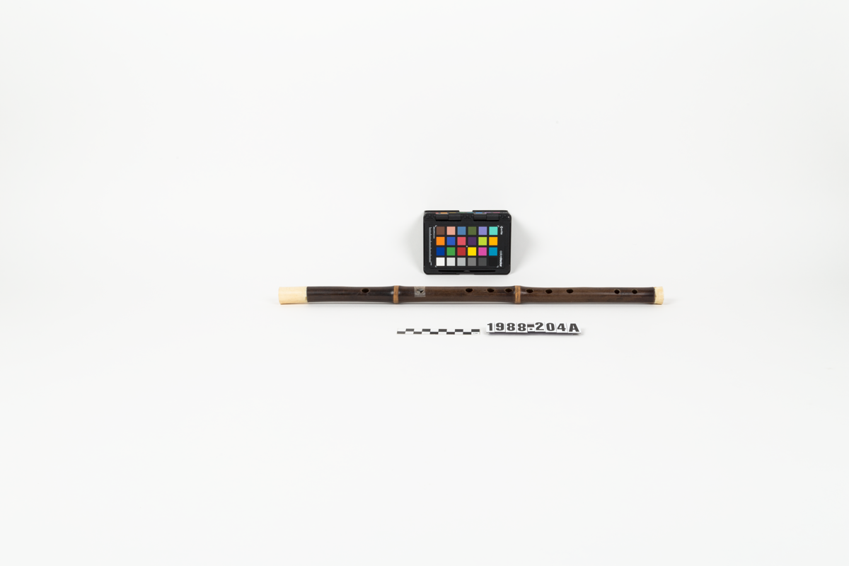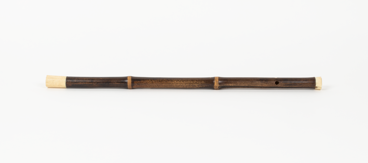 Side blown flute with bone finials. Noted by Matthew Hill, Royal College of Music MINIM project cataloguer and photographer.