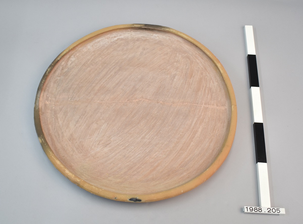 Large earthenware dish. Was cracked in middle but has been conserved.