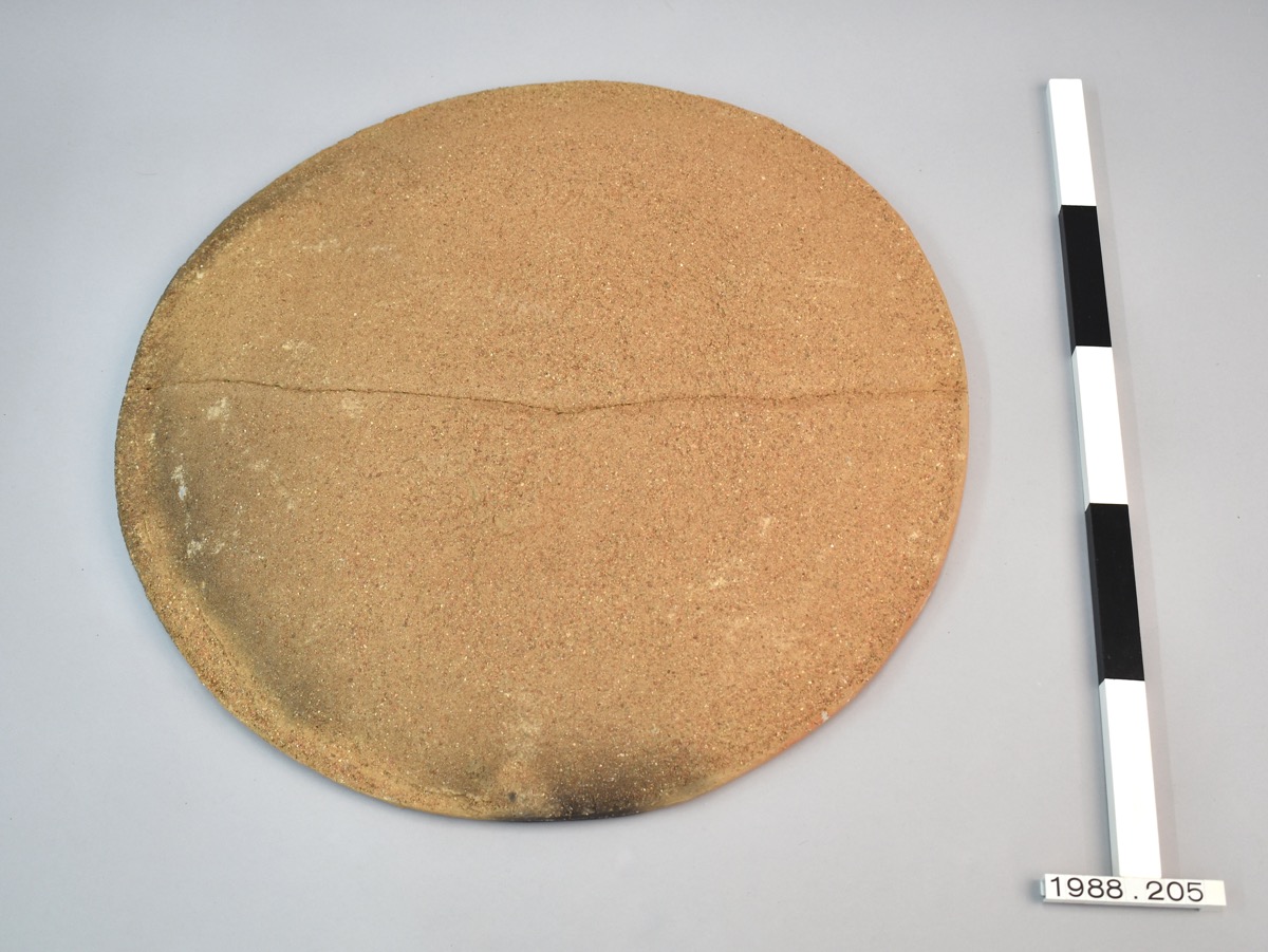 Large, shallow, earthenware comal or dish. The underside is coated in sand or grit; rim slightly rolled towards the interior of the dish which is burnished in long lines. Previously broken in half but now repaired. Fire-blackened in places.