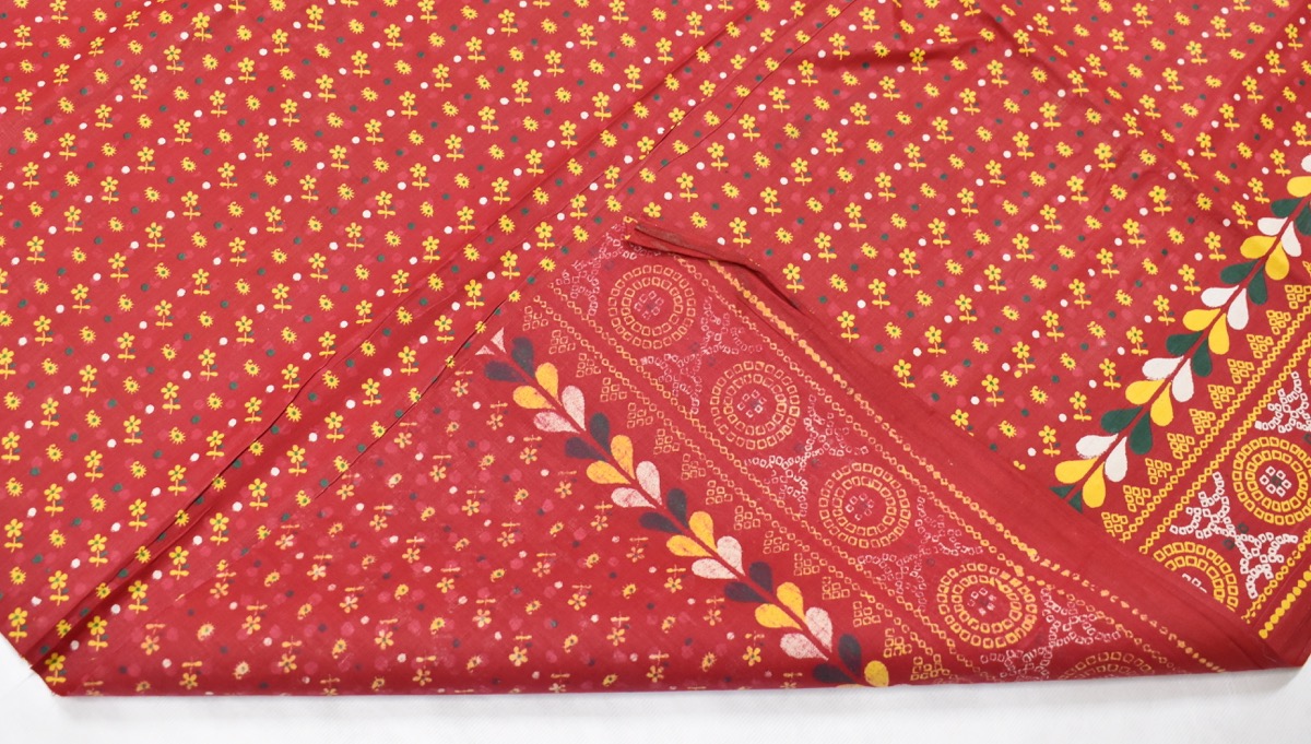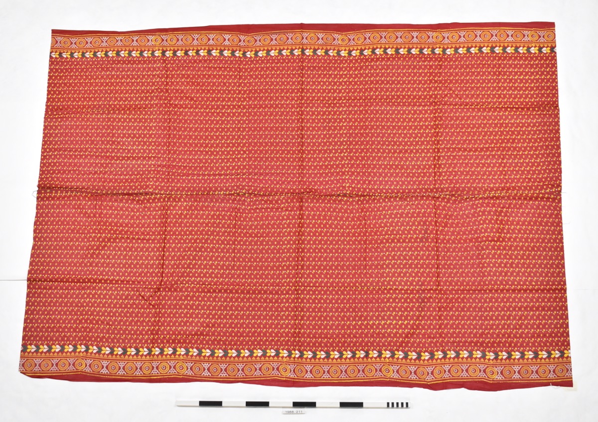 Odhani. Large rectangular piece of red cotton, formed of two sections, with seem running horizontally along the centre. Printed decoration in yellow, white, and green dye. The central section features a repeating floral and dot motif, whilst the borders along the longest edges include bands of geometric pattern. Raw edge at the shortest sides.