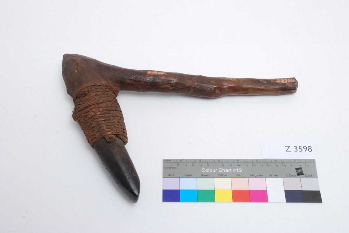 Hafted adze. 'V'-shape shaft of dark wood, circular in section and irregular in width, with visible knots. Irregular butt. The 'bend' at the top is pointed. The shortest part of the shaft has been hollowed out and made convex to receive a layer of coir and the adze head of dark black stone. The adze head and the shaft are bound with a tight lashing of 3-ply plaited coir into which two slivers of wood have been inserted. The adze head is almost oval in section, convex at the top and flat underneath. Rounded sides. The cutting edge formed of the surface slanting at the top and bevelled underneath.