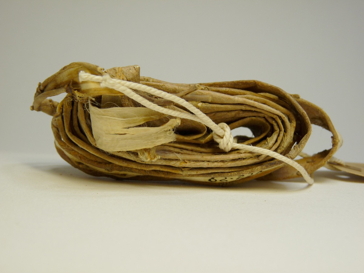 Sample of outer bark of the masi tree, Broussonetia papyrifera (Linn.) also known as paper mulberry. Rolled up and tied with a piece of string.