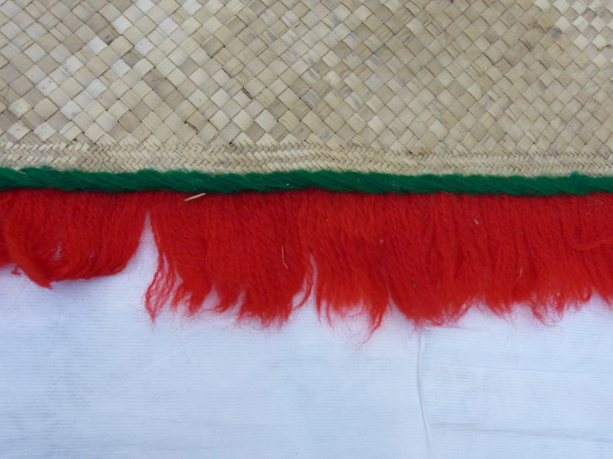 Rectangular kula mat woven from thin strips of pandanus leaf (0.8cm). The centre of the mat has four large rectangles decorated with black patterns: two of the va'kadi vilivili ('like a swarm of black ants' - name recorded by Rod Ewins in this study of Gauan mat-making, 1982, name might differ in Vanua Levu) and two chequerboard filled with diagonal lines. Five squares of black diagonal lines decorated the centre. Black patterns not visible on the underside. Woollen border in green wool with red fringes. Longer ties of green wool in the corners. Good condition.