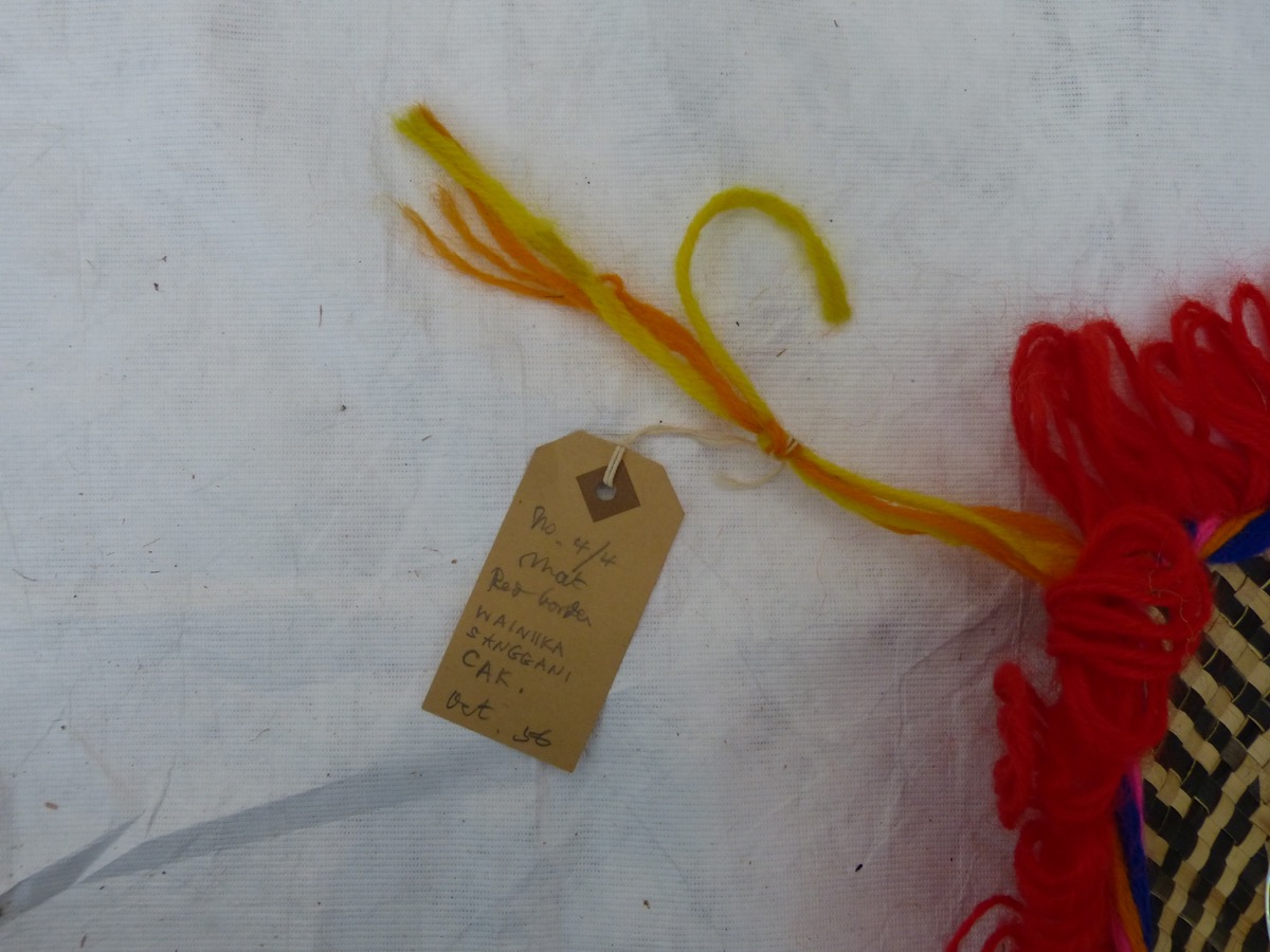 Labels & inscriptions: A modern rectangular cream label attached to the edge of the mat reads [stamped in black ink:] '62.216 d'.On the other side, [handwritten in pencil:] '4/4 Mat red border WAINIIKA SANGGANI CAK. Oct.56'