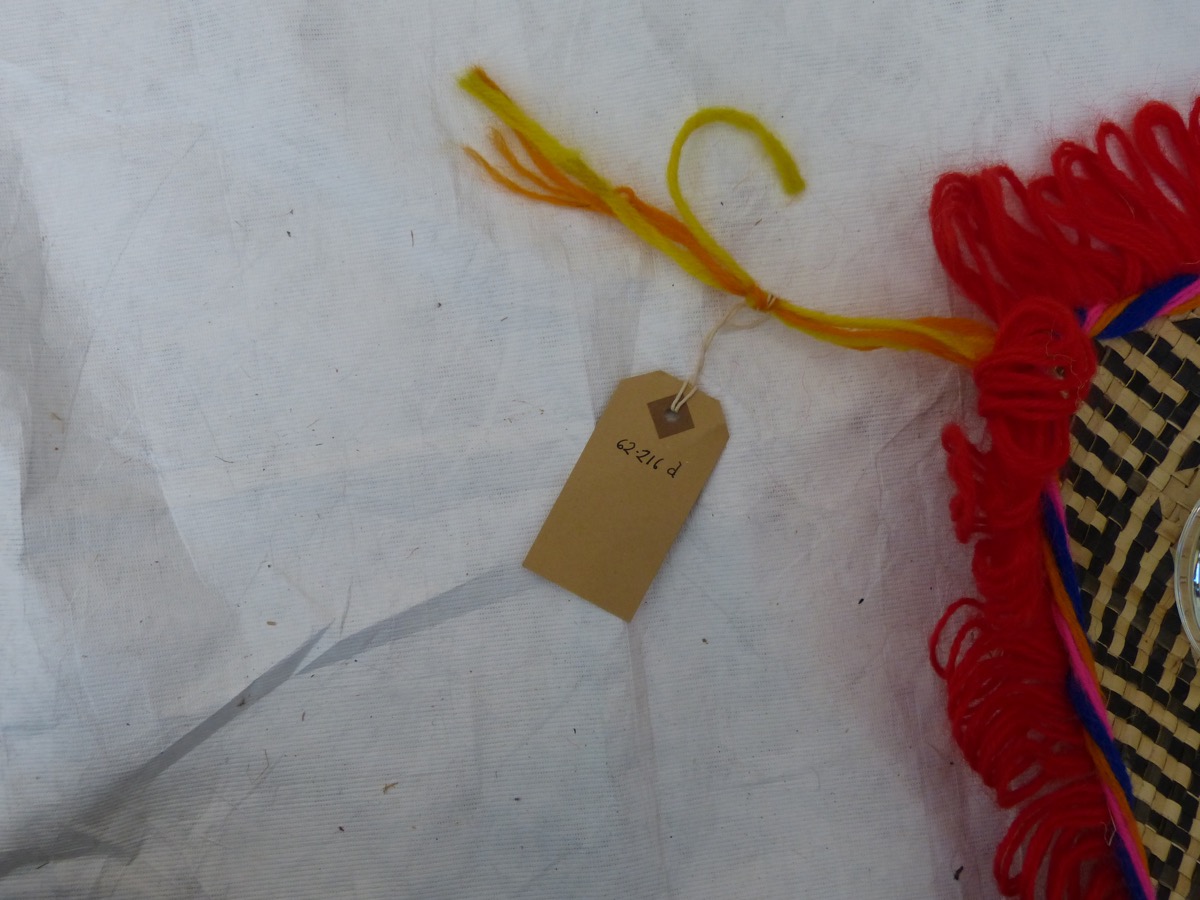 Rectangular kula mat woven from thin strips of pandanus leaf (0.7cm). Two concentric internal borders of black striated triangles. Diagonal pattern in black in the centre. Black patterns not visible on the underside. Woollen border in blue, bright pink and orange and red fringe. Longer ties of yellow and orange wools attached to the corners. Good condition.