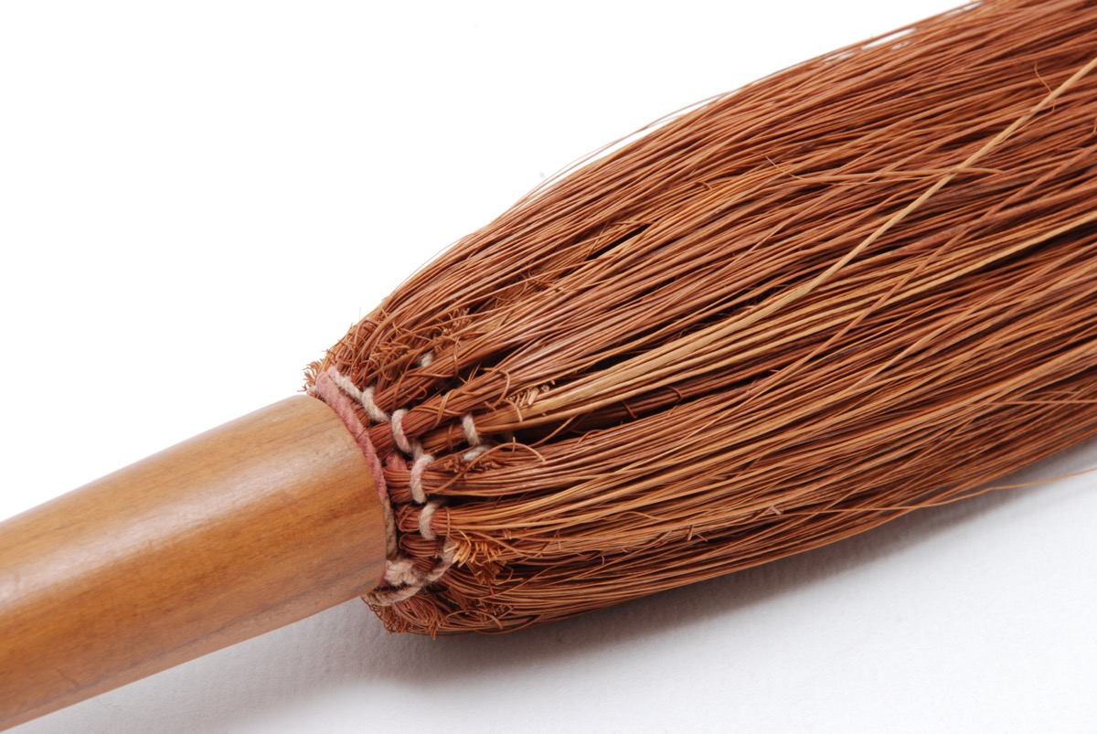 Flywhisk. shaft of Dacrynium elatum wood (yaka), circular in section, and flaring towards the butt. A shallow incised line decorated the shaft about 1 cm from the butt. A round wood inlay placed in the centre of the butt. The top of the shaft extends inside the whisk, but is narrower in section. Tassels of coir fibre are attached to this projection and maintained in placed with lengths of twisted ?cotton cords (one dyed red) (L.Carreau, 19/09/2012).