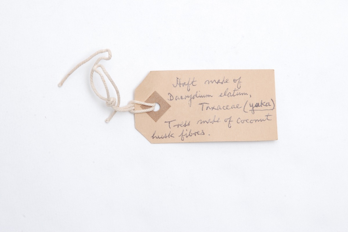 A large cream label attached to the shaft reads [handwritten in blue pen:] 'Fly switch (I roi) From NGAU island, FIJI. 62.276a. Over.' on one side and 'Haft made of Dacrydium elatum, Taxaceae (yaka). Tress made of coconut husk fibres.' on the other side.