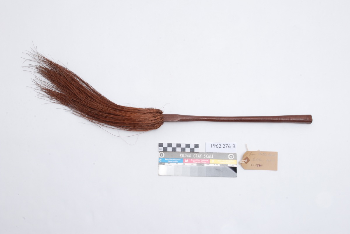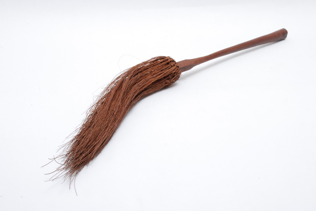 Flywhisk. shaft of dark wood, square in section at the top, turning into a circular section, and flaring towards the butt. The top of the shaft is carved with a deep groove to which are tassels of long coir fibre. Each tassel is twisted for about 3 cm, then tied with a loose knot. The surface of the wood covered in very small specks of a clear varnish-like substance (L.Carreau, 19/09/2012).