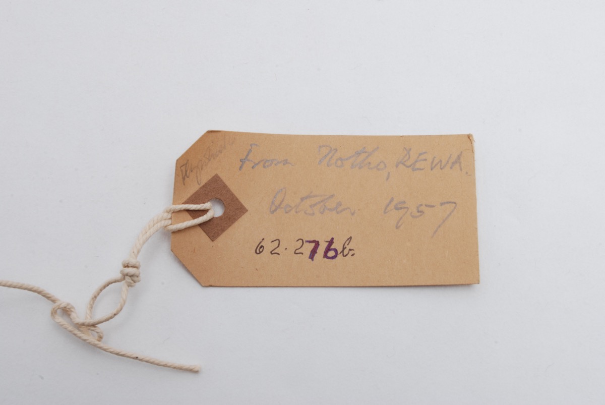 A large cream label attached to the shaft reads [handwritten in pencil:] 'Flywhisk. From Notho, REWA. October 1957.' [added in blue pen:] '62.276 b.'