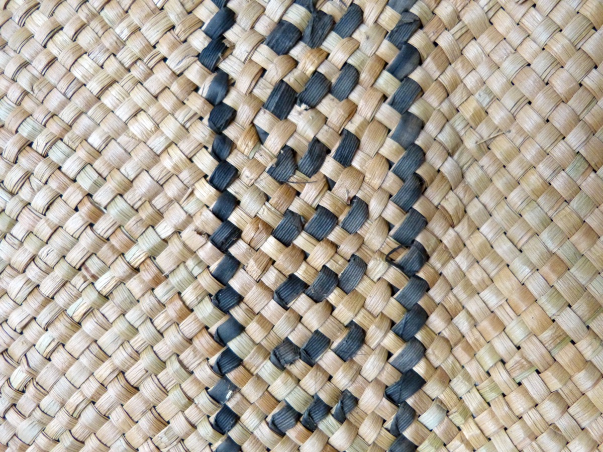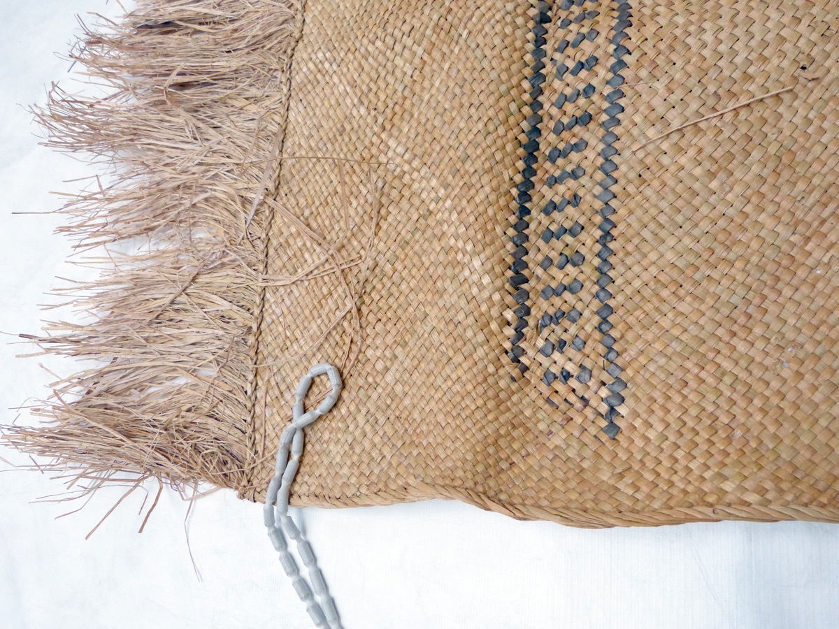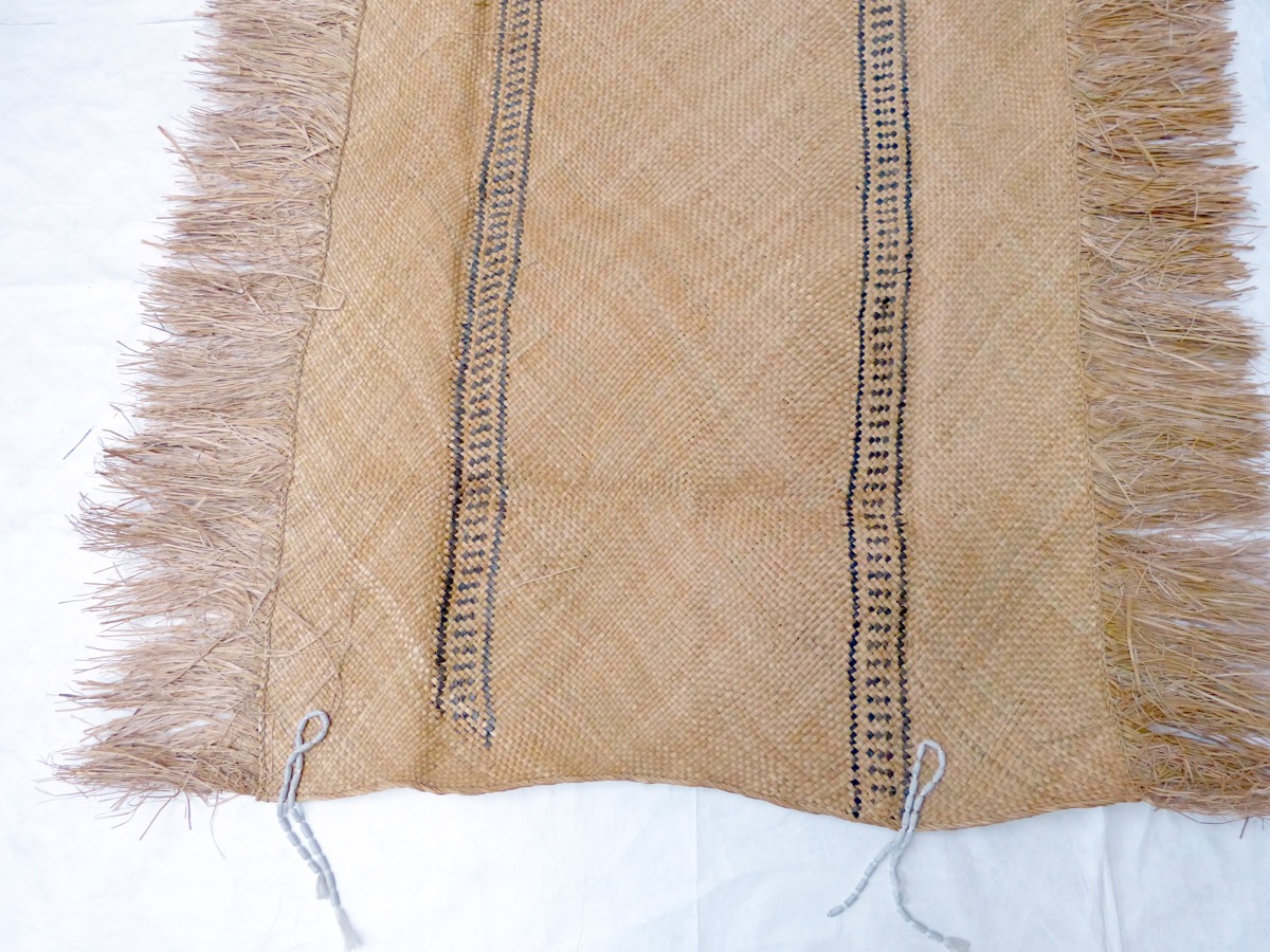 Rectangular mat of soft sedge (Kuta), Elaeocharis plantaginea, Cyperaceae. Strips about 0.5 cm wide. Some sedge fibres have been dyed black and woven into the mat to create a pattern of 2 x two black longitudinal lines enclosing small diagonal lines. The long edges are decorated with a fringe of sedge fibre.