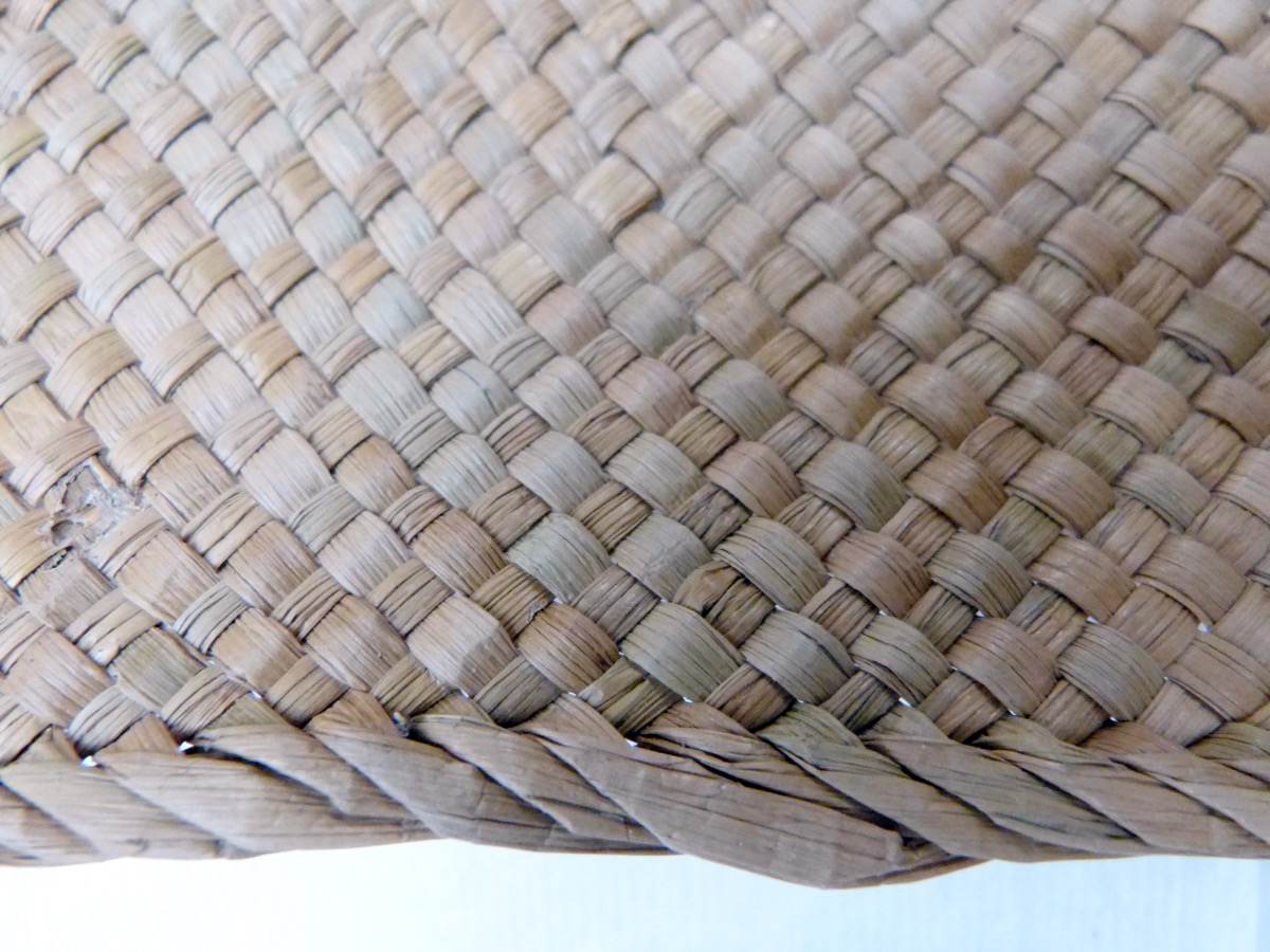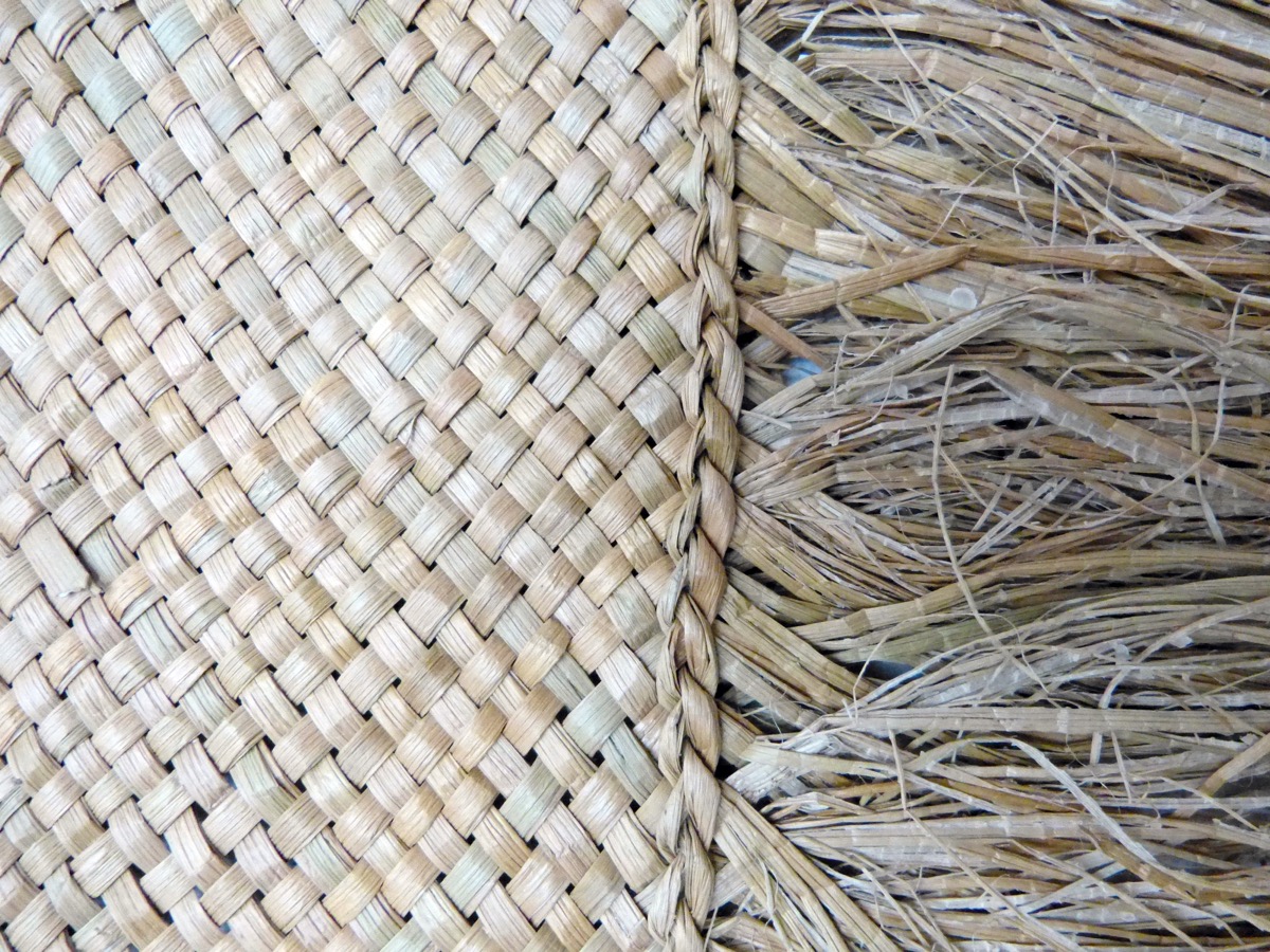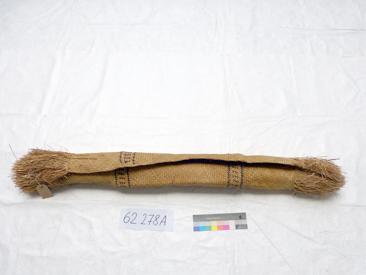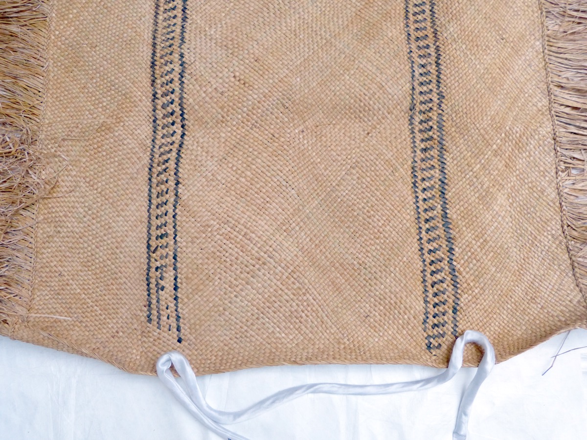 Rectangular mat of soft sedge (Kuta), Elaeocharis plantaginea, Cyperaceae. Strips about 0.5 cm wide. Some sedge fibres have been dyed black and woven into the mat to create a pattern of 2 x two black longitudinal lines enclosing small diagonal lines. The long edges are decorated with a fringe of sedge fibre.